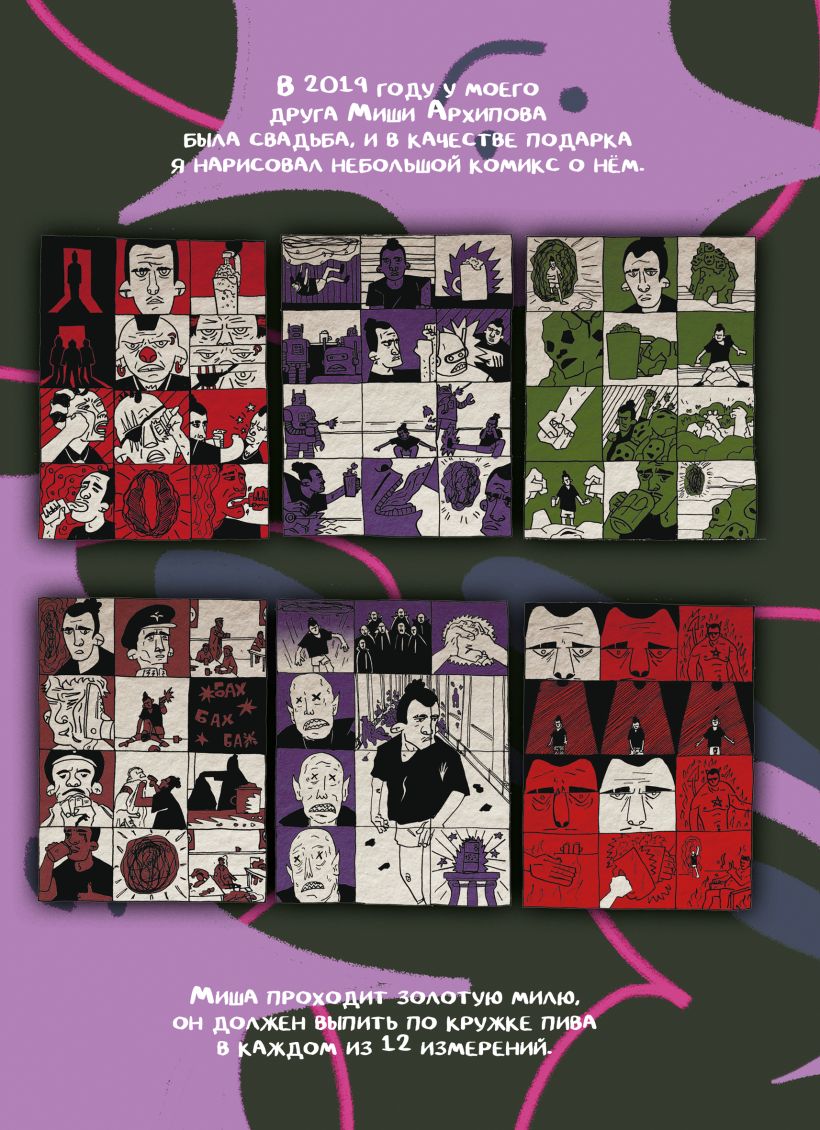 Алексей Хромогин — тульский художник, один из самых продуктивных современных комиксистов. Он рассказывал вам мрачную детективную историю «Огни в лесу», пронизанную мистикой российской глубинки, и вымышленную меланхоличную биографию Гагарина в этюде «Первый человек на земле». Размышлял вместе с Виталием Терлецким над самоцензурой в «50 лет любви» и шутил над А.С. Пушкиным в комикс-анекдоте «Автор». Помимо этих больших работ, были и маленькие, но не менее интересные — для конкурсов, сборников, для себя. Именно такие работы Алексей собрал в этом сборнике, сопроводив своими комментариями и короткими байками из творческой жизни последних 5 лет.