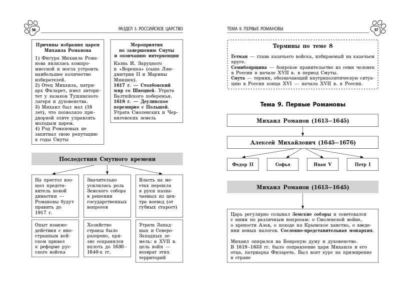 В справочнике кратко и доступно изложены основные сведения по истории России за 6, 7, 8, 9, 10 и 11 классы. Информация систематизирована и сфокусирована на самых важных разделах курса, знание которых проверяется экзаменом: «Русь в IX—XII вв.», «Раздробленность и формирование единого государства», «Российское царство», «Начало империи. XIII в.», «Российская империя в XIX в.», «Первая половина XX в.», «Послевоенное развитие СССР», «Новая Россия».