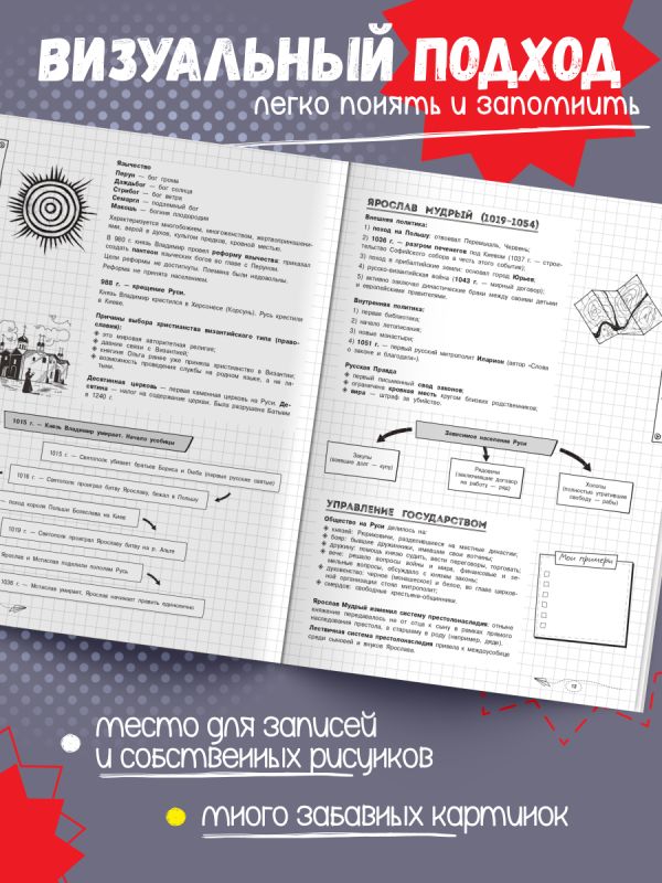 Благодаря наглядной подаче теории с примерами, схемами, а также забавными рисунками, текст становится доступным и интересным. Визуальный подход обеспечивает легкость восприятия и запоминания информации, ведь она оформлена в виде конспектов, словно ученик писал их сам. Всевозможные иллюстрации и места для собственных примеров и примечаний помогут сделать процесс обучения максимально простым и приятным! А при желании можно взять маркеры и сделать свой конспект еще более уникальным и персонализированным!