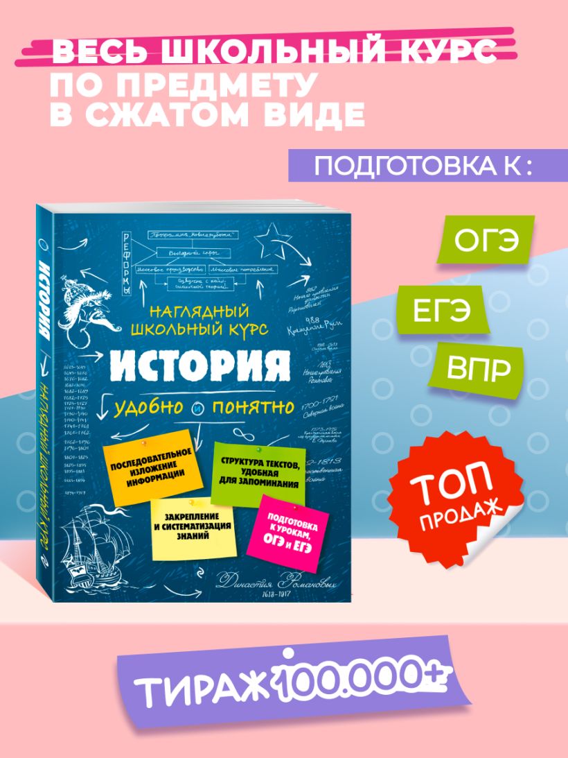 Справочник по истории в наглядных конспектах для учеников 6, 7, 8, 9, 10 и 11 классов превращает изучение каждой темы в увлекательное и познавательное приключение! Книга поможет запоминать и повторять материал на протяжении всего школьного курса. Благодаря наглядной подаче теории с примерами, схемами, а также забавными рисунками, текст становится доступным и интересным. Визуальный подход обеспечивает легкость восприятия и запоминания информации, ведь она оформлена в виде конспектов, словно ученик писал их сам. Всевозможные иллюстрации и места для собственных примеров и примечаний помогут сделать процесс обучения максимально простым и приятным! А при желании можно взять маркеры и сделать свой конспект еще более уникальным и персонализированным! • Все темы школьного курса. • Доступная подача материала. • Наглядные схемы и таблицы. • Множество забавных картинок. • Место для ваших записей и собственных рисунков. Погрузитесь в увлекательный мир истории вместе с наглядным справочником для подростков и почувствуйте, как знания становятся ближе, а учеба лучше! Книжка поможет подготовиться к ОГЭ, ЕГЭ и другим экзаменам 2026. Также пособие будет полезно для занятий родителей с детьми. Автор Мария Селиверстова — опытный репетитор, основатель онлайн-школы «История и котики», ведущая популярного блога про историю и подготовку к экзаменам (общее число подписчиков свыше 130 000!).