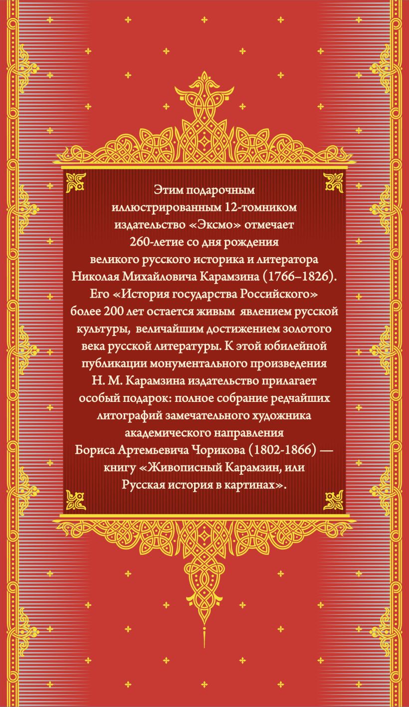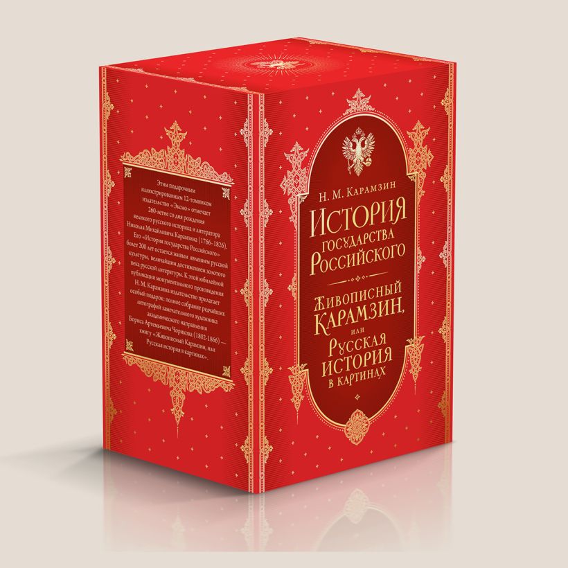Этим подарочным иллюстрированным 12-томником в пяти книгах издательство «Эксмо» отмечает 260-летие со дня рождения великого русского историка и литератора Николая Михайловича Карамзина (1766—1826). Его «История государства Российского» более 200 лет остается живым явлением русской культуры, величайшим достижением золотого века русской литературы.
