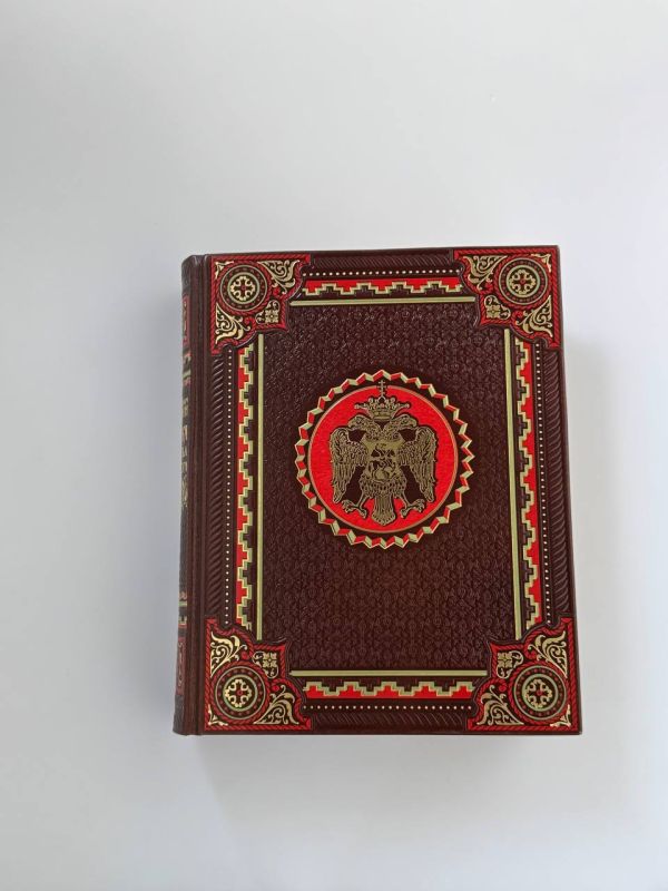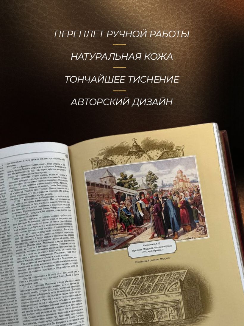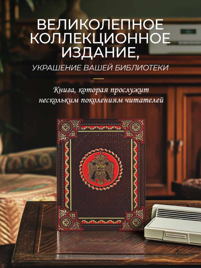 Книга в коллекционном переплёте, изготовленном из натуральной гладкой кожи, украшенном тончайшим тиснением в русском стиле. На предней сторонке изображен герб России, на корешке использован рукописный шрифт. Книга отпечатана на белой бумаге с лёгкой текстурой. Более 150-ти редких графических иллюстраций в тексте.