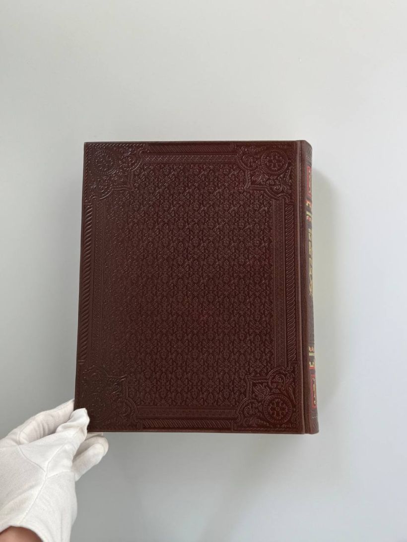 Форзацы из дизайнерской тонированной бумаги. Обрез окрашен в цвет переплёта, торшонирован и вызолочен вручную.