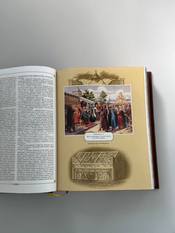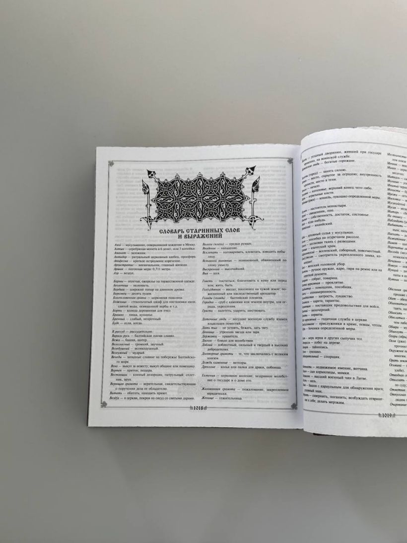 Лента для закладывания страниц и каптал, скрепляющий верх и низ объемного тома, изготовлены из шелка. К книге прилагается красочный сертификат, подтверждающий уникальность издания, он вложен в каждый экземпляр и пронумерован вручную.