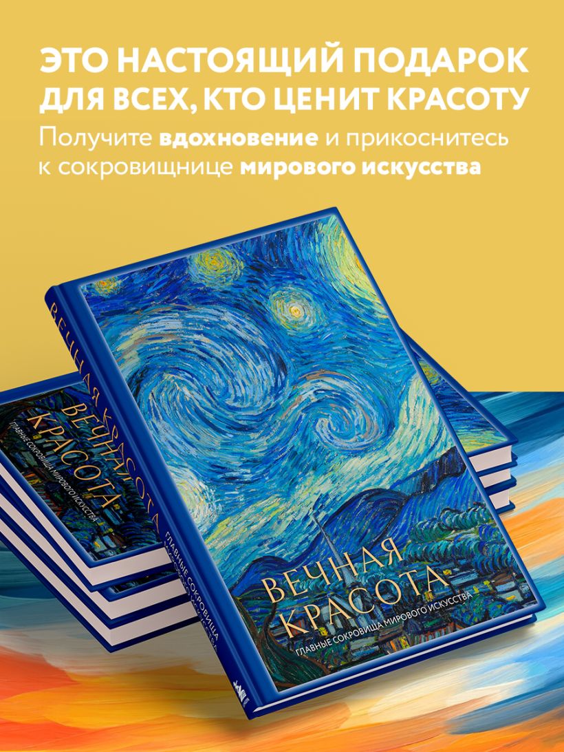 Подарочное издание с эффектом стерео-варио на переплете погружает читателя в мир искусства уже на этапе обложки — вы увидите, как оживает одно из самых известных произведений искусства в мире художника Винсента Ван Гога и захотите узнать еще больше о главных шедеврах. На страницах этого богато иллюстрированного издания собраны самые значимые и важные предметы искусства, которые можно рассмотреть в деталях и узнать об их истории и смыслах. Автор доступно и увлекательно рассказывает о развитии скульптуры, архитектуры и живописи от Античности до XIX века, и подробно разбирает каждый шедевр. Большой формат, великолепное оформление, мелованная бумага делают процесс знакомства с книгой настоящим эстетическим удовольствием, благодаря которому читатель сможет получить вдохновение и прикоснуться к сокровищнице мирового искусства.