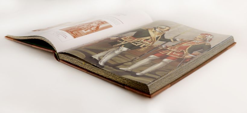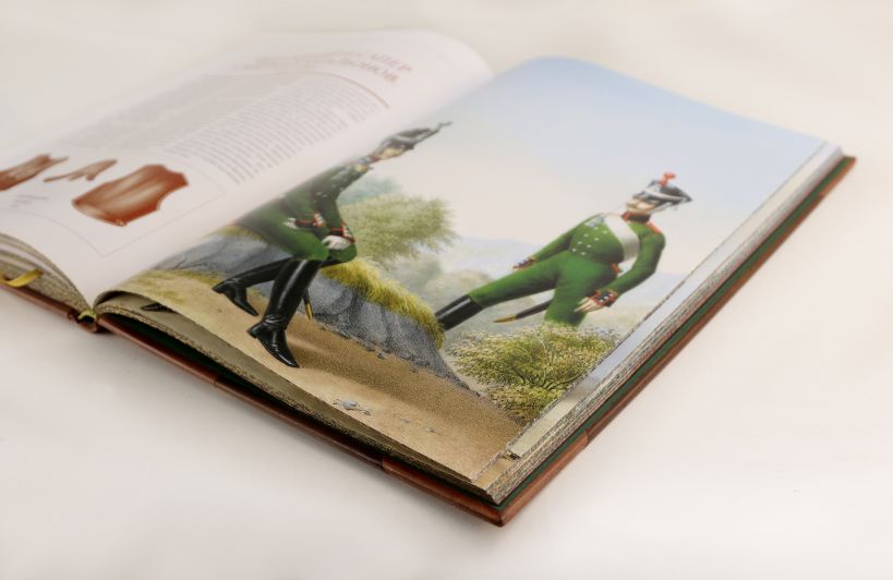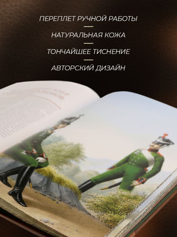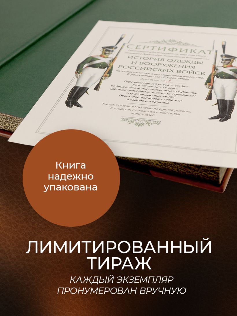 История одежды и вооружения российских войск. Книга большого формата с цветными иллюстрациями и в коллекционном кожаном переплете ручной работы изящным тиснением
