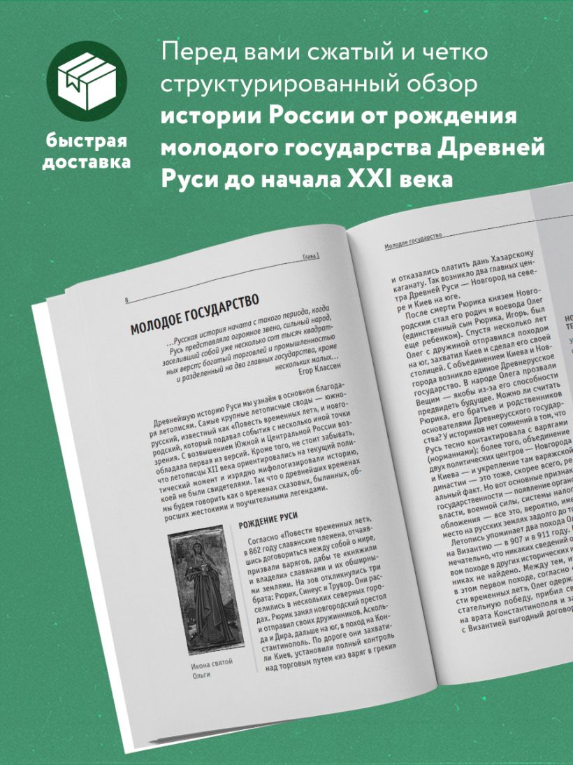 «История России. Знания, которые не займут много места» — это увлекательный и полезный ресурс для всех, кто хочет освежить знания об истории России, но не знает, с чего начать. Перед вами сжатый и четко структурированный обзор истории России от рождения молодого государства Древней Руси до начала XXI века. Ключевые события, имена и даты изложены в простой и ясной форме, так что вы легко научитесь ориентироваться в отечественной истории. Четкая структура и доступный язык позволят быстро привести в порядок знания по истории России за небольшой срок, поэтому книга станет незаменимым помощником школьникам и студентам, а также всем, кому небезразличны прошлое, настоящее и будущее страны.