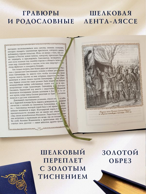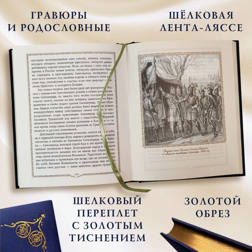 Издание в твёрдом переплёте с шёлковым покрытием и золотым тиснением. Золотой обрез. Шёлковая лента-ляссе. Плотная бумага, чёткий, удобный для чтения шрифт. В оформлении книги использованы старинные гравюры, приводятся генеалогические древа русских княжеских родов и царствующих фамилий.
