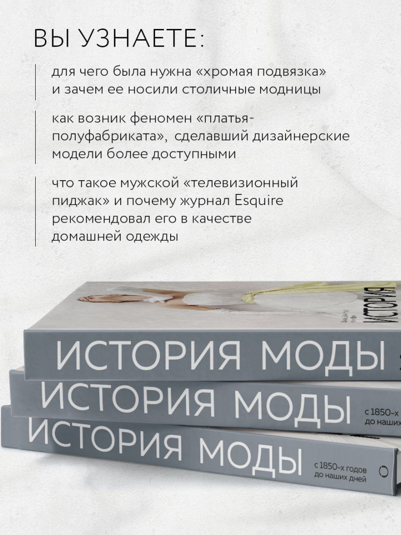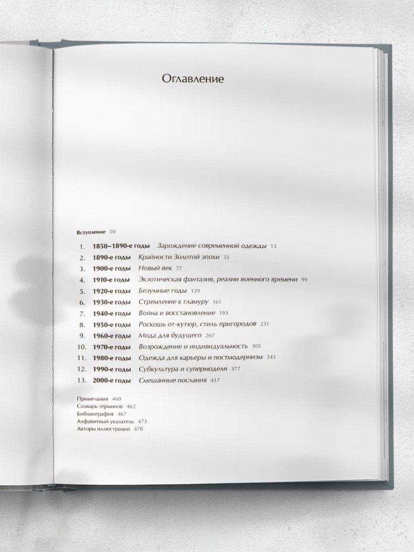 Более 600 иллюстраций: изображения экспонатов из коллекций музеев моды, фотографии и рисунки из модной прессы, архивные снимки моделей и рекламные баннеры — книга проиллюстрирует, как менялась мода в зависимости от социальных и культурных трендов, как одевались иконы стиля и обычные люди на протяжении 160 лет.