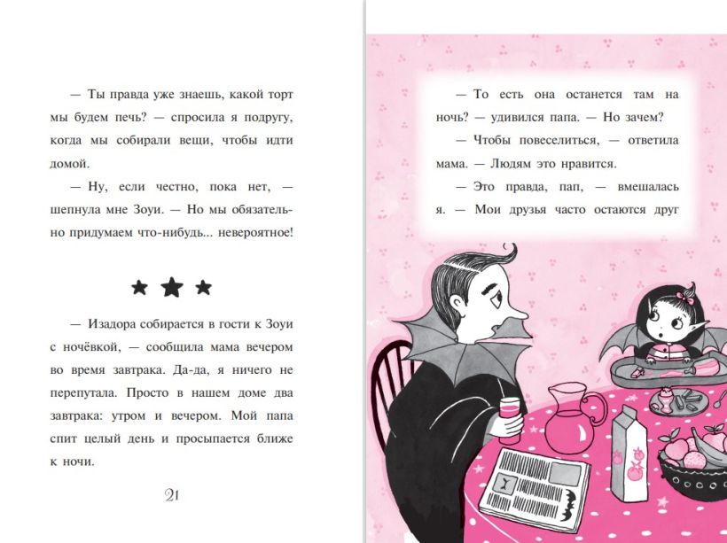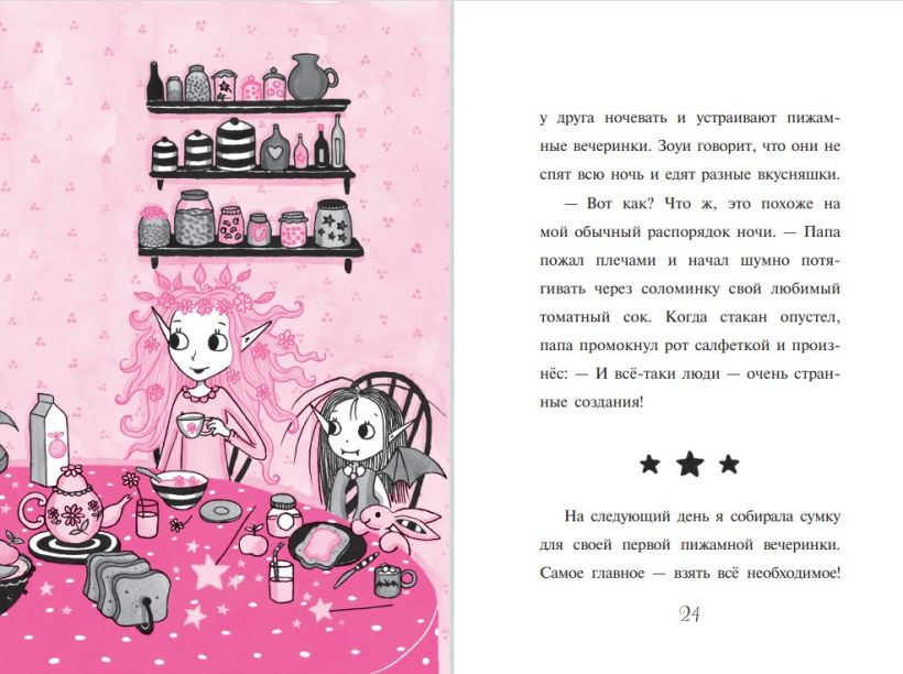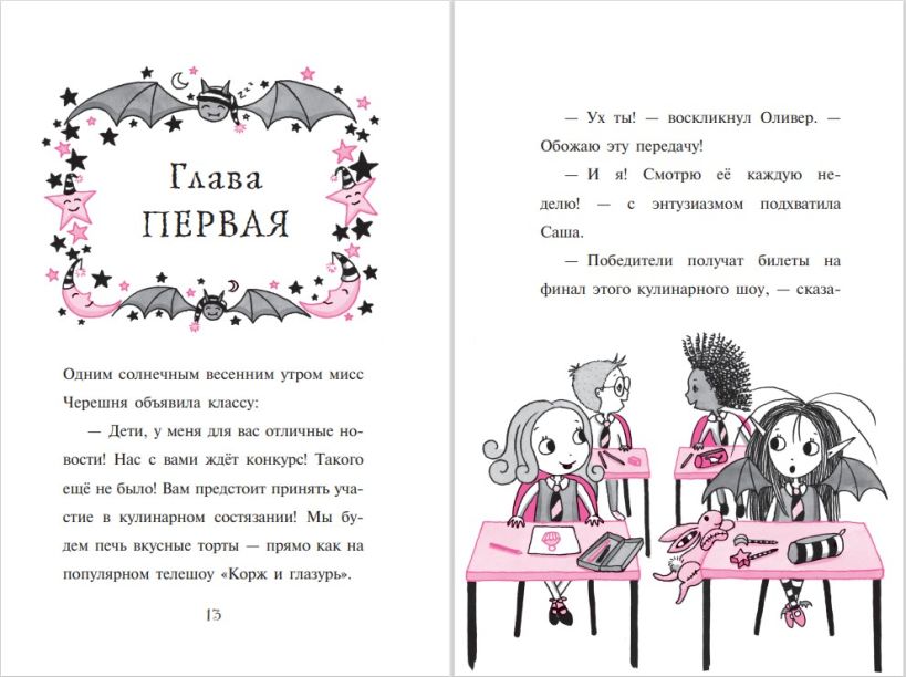 Внутри — красивые чёрно-розовые иллюстрации и рецепт волшебного торта!