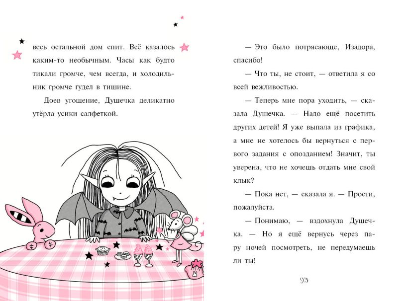 У Изадоры зашатался молочный зуб! У вампиров принято хранить выпавшие клыки в рамке под стеклом, а феи отдают свои зубки зубной фее. Изадора никак не может решить, как ей поступить… пока однажды ночью к ней не наведывается волшебная мышка. Благодаря её помощи Изадора создаёт новую традицию. Совершенно необыкновенную — такую же, как она сама!