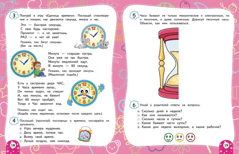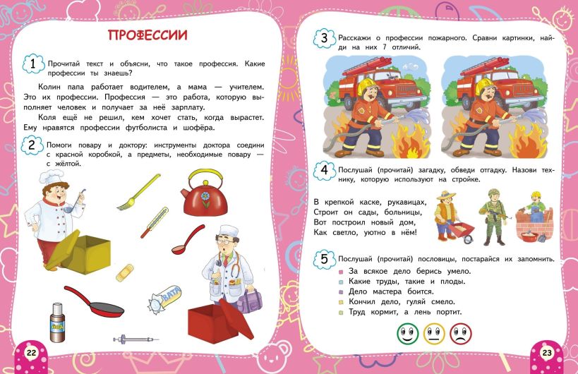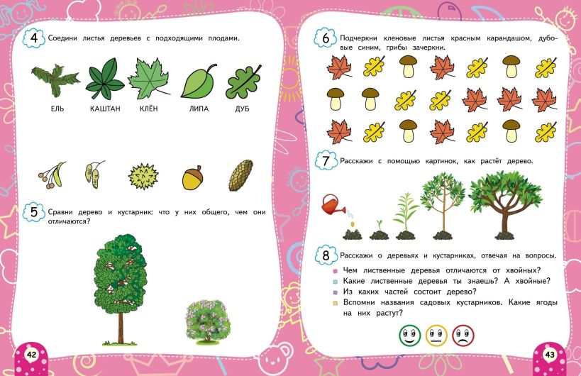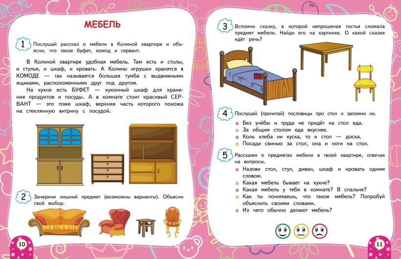 В пособии рассматриваются важнейшие темы: «Моя Родина», «Животные и растения», «Профессии», «Транспорт», «Мебель», «Обувь и одежда» и другие. В конце каждого раздела есть вопросы, которые помогут родителям оценить уровень знаний ребёнка. После ответа дошкольника взрослому следует закрасить один из смайликов: если ребёнок ответил хорошо — весёлый смайлик зелёным карандашом; если ответ средний — спокойный смайлик жёлтым цветом; если ответ слабый — грустный смайлик красным карандашом, — и вернуться ещё раз к этой теме.