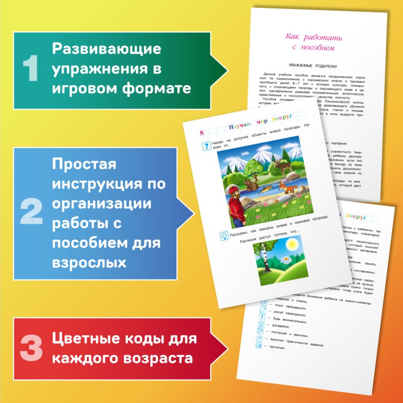 Пособие содержит обширный материал по основным темам курса «Окружающий мир», который даст возможность расширить представления дошкольника о природе, человеке, космосе, обществе, родной стране. Для закрепления материала после каждого тематического блока приведен небольшой проверочный тест, который поможет оценить степень освоения ребенком учебного материала.
