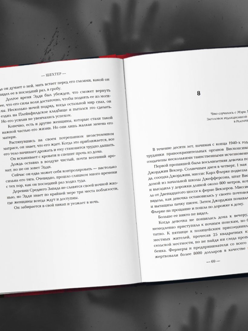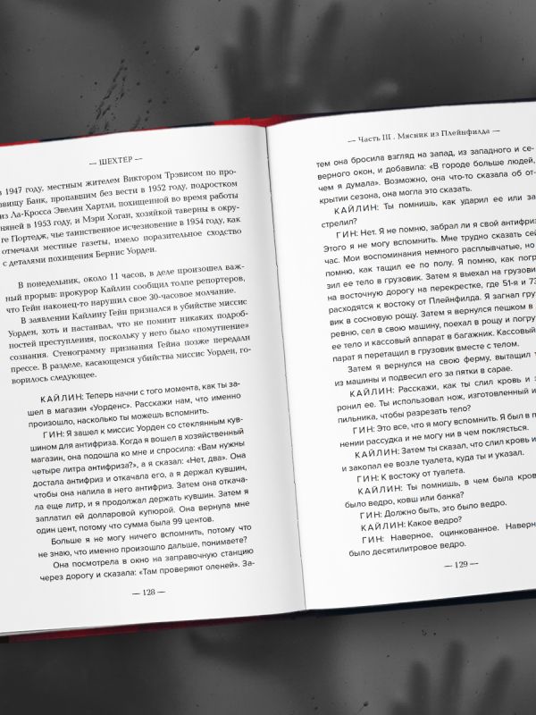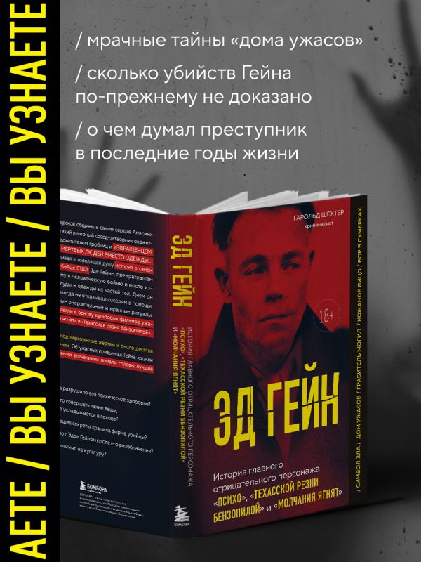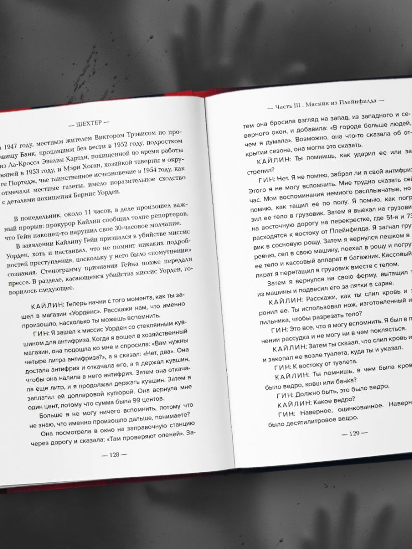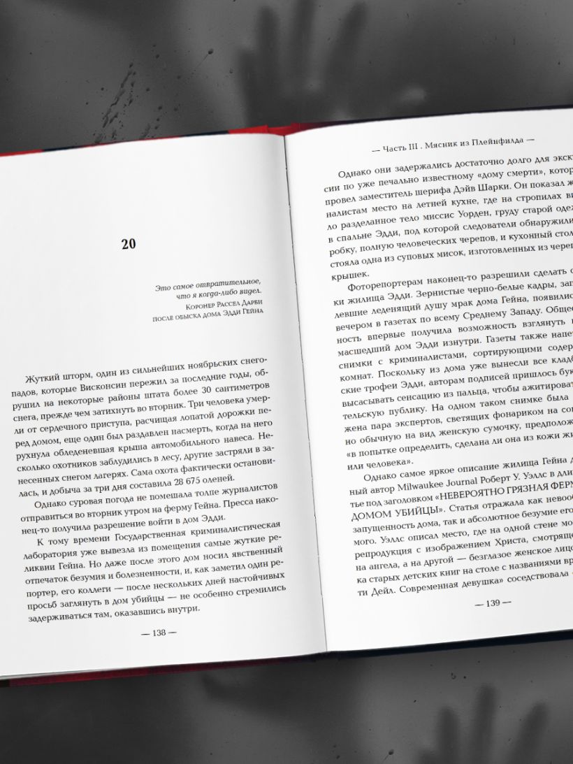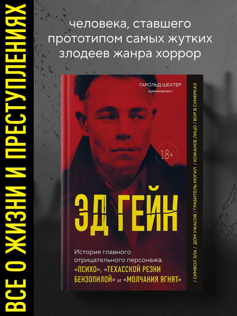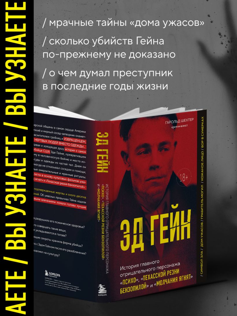 В книге «Эд Гейн» Гарольд Шехтер рассказывает историю серийного убийцы, чье имя прогремело на весь мир. Эд Гейн известен как «мясник из Плейнфилда». Он был расхитителем гробниц и извращенцем, который превратил свою ферму в мастерскую по изготовлению мебели, посуды и одежды из частей человеческих тел.