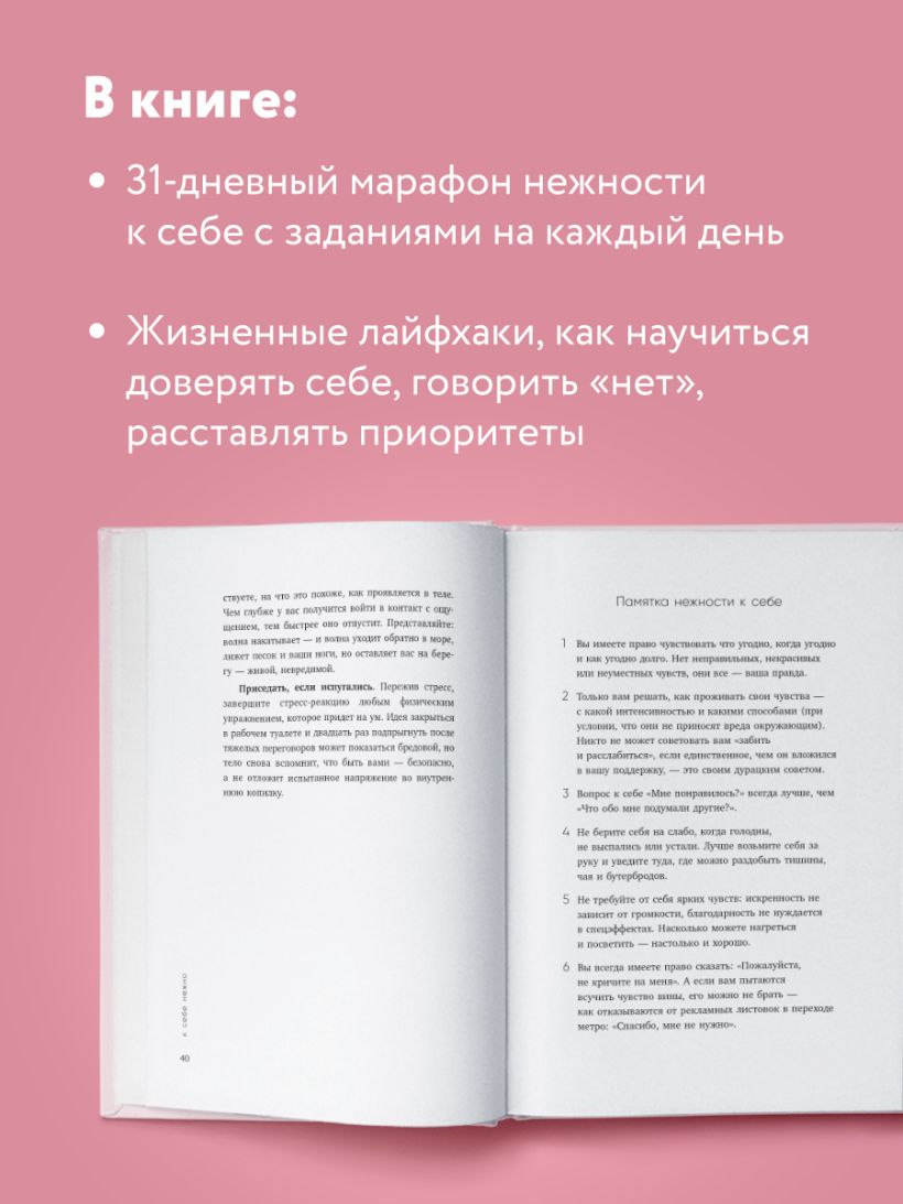 Итог: читать можно всем. Особенно тем, кому не хватает заботы и тепла. Саму книгу можно прочесть за 2-3 дня. Но там есть практики, которые можно делать месяц. Я больше половины итак делаю, а остальные взяла на заметку. Текст читается легко, нет сложных предложений и замудреных слов. Из минусов, в некоторых местах можно пустить слезу