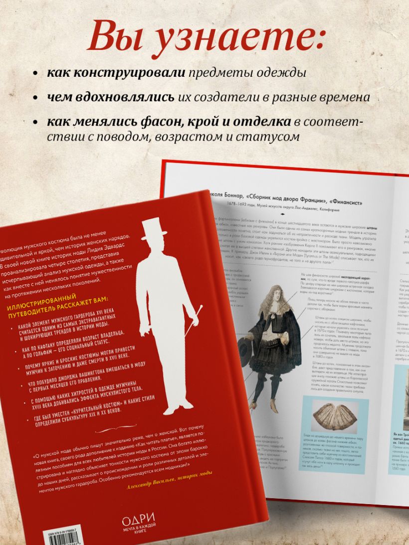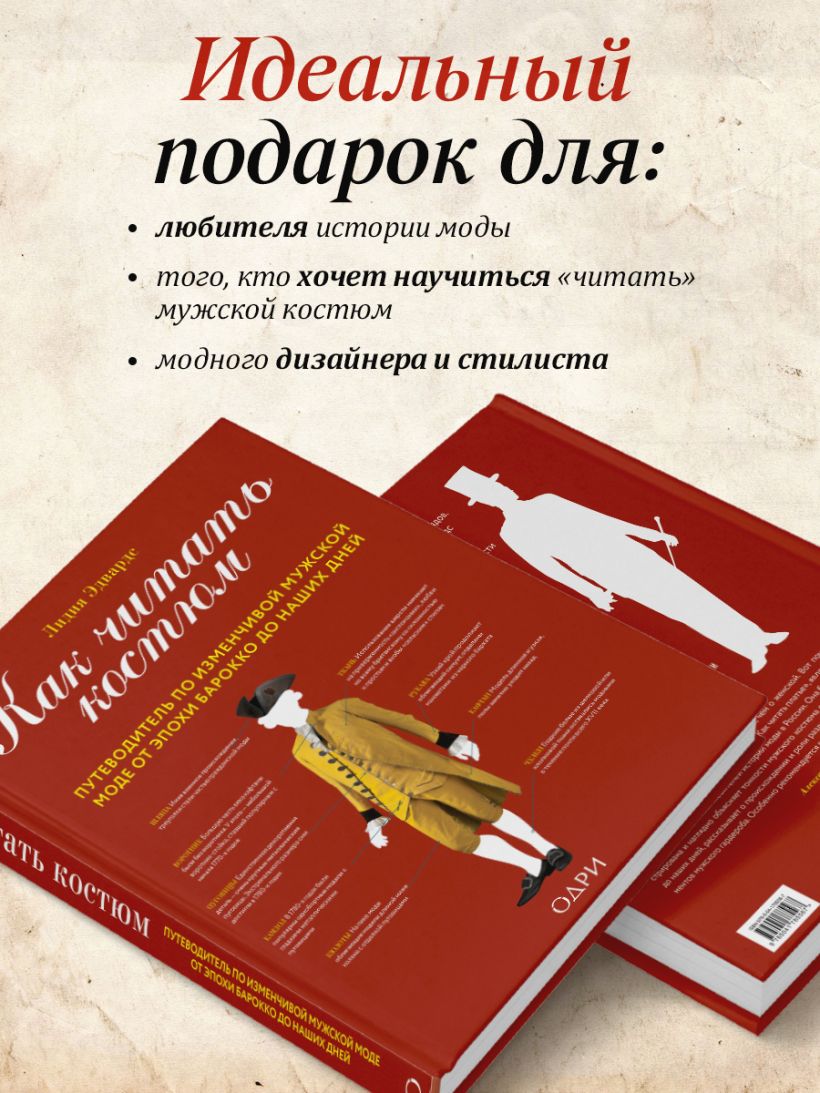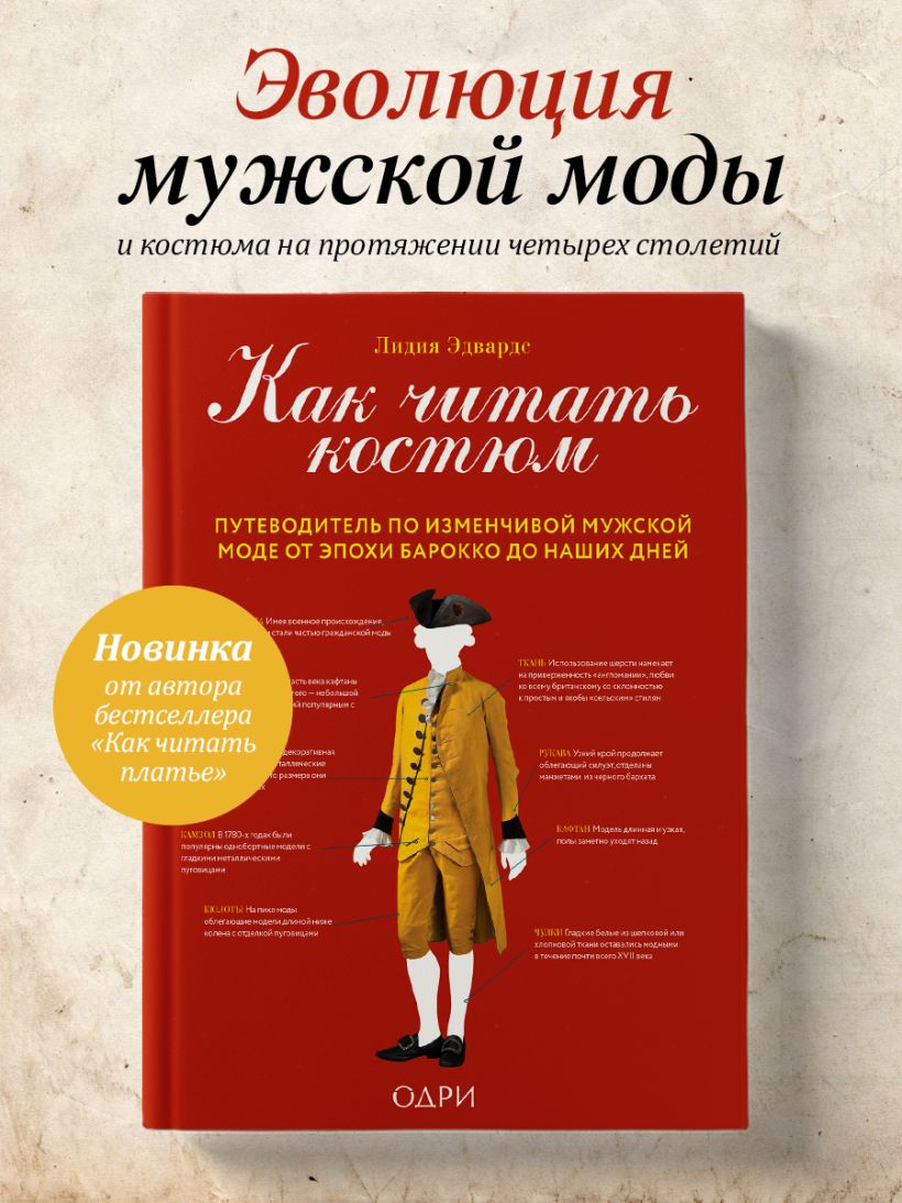 Новая книга историка моды и автора бестселлера «Как читать платье» Лидии Эдвардс — это исчерпывающий путеводитель по эволюции мужской моды и костюма на протяжении четырех столетий. Книга станет идеальным пособием для тех, кто хочет научиться отличать пальто «честерфилд» от ольстерского; разбираться в стилях денди и тедди-боя; понимать разницу между кафтаном, фраком и смокингом. Вы узнаете, как конструировали предметы одежды и что вдохновляло их создателей в разные времена. Познакомитесь с тем, как менялись фасон, крой и отделка в соответствии с поводом, классовой принадлежностью, возрастом и социальным статусом владельца. Сопровождающий текст кратко познакомит вас с историческим контекстом каждой из эпох, а избранные портреты, редкие фотографии, музейные экспонаты и рекламные материалы с максимальной яркостью проиллюстрируют тот или иной стиль, перенеся вас в далекое прошлое.