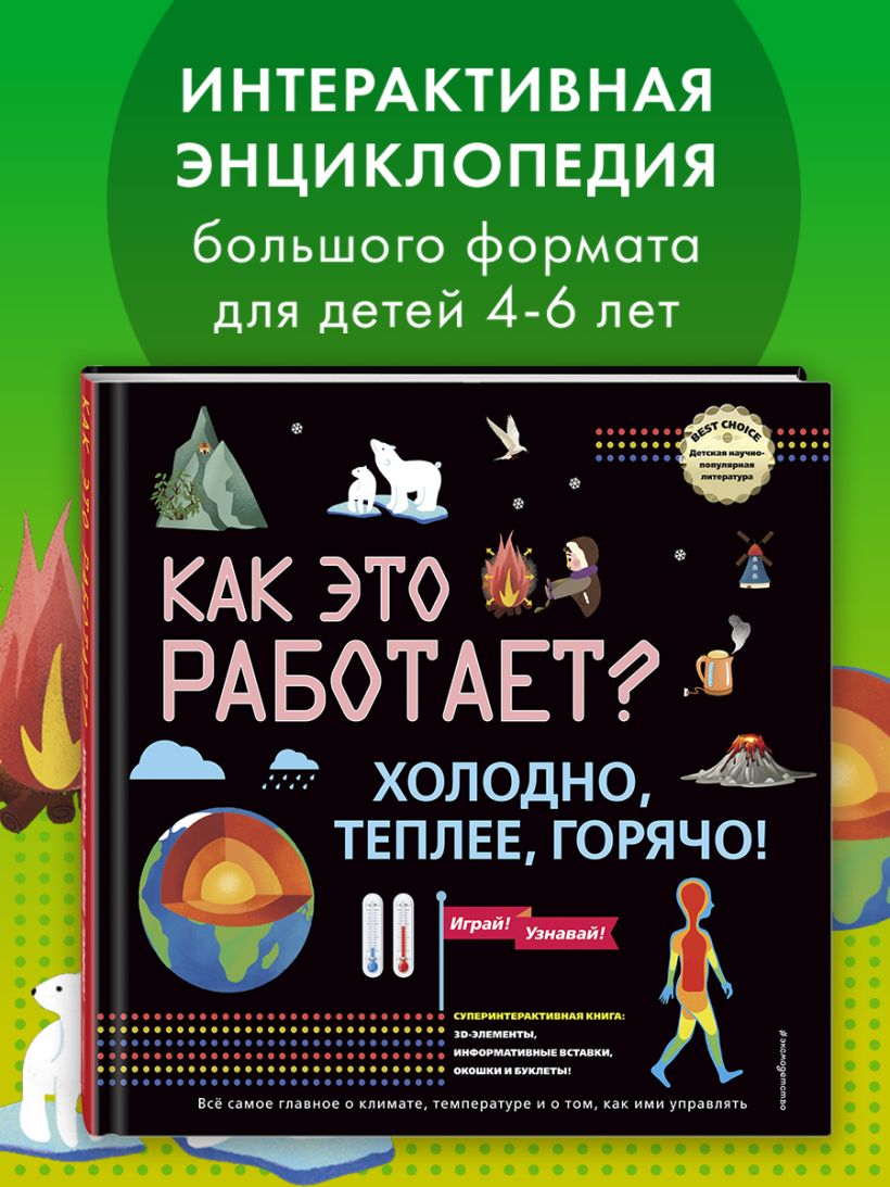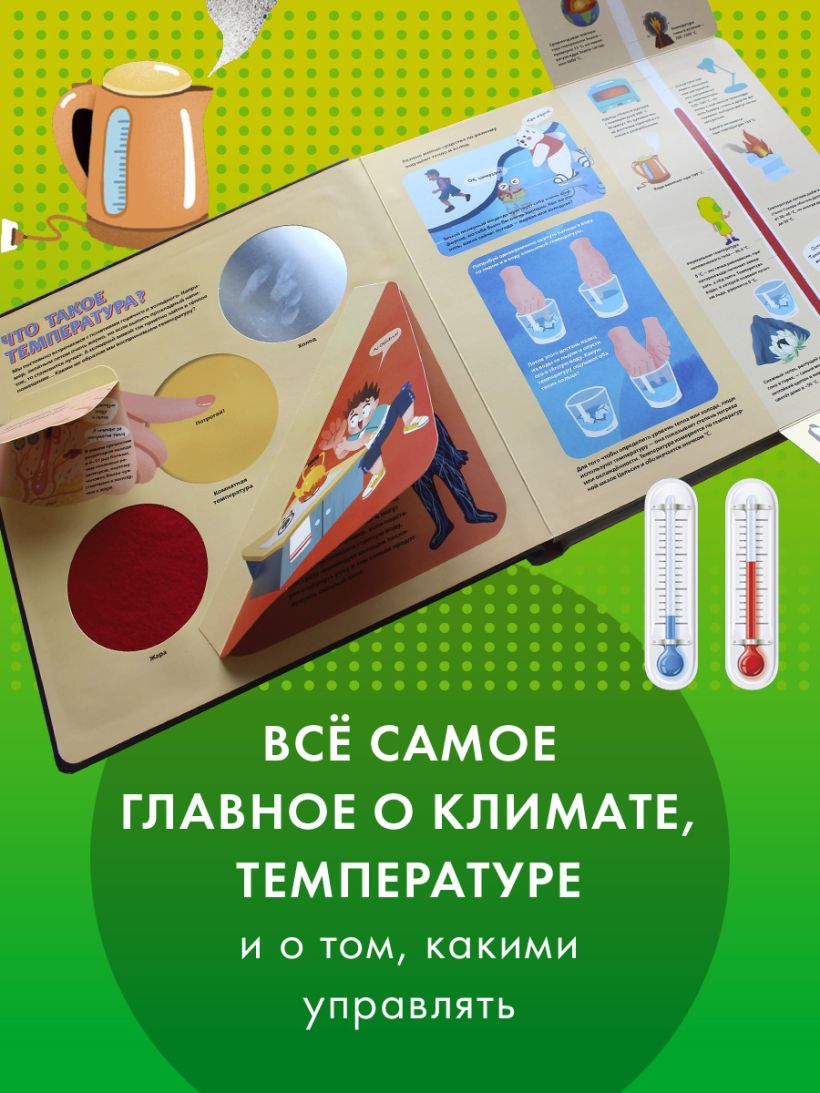 Эта СУПЕРинтерактивная познавательная энциклопедия ПРОСТО И ЗАХВАТЫВАЮЩЕ расскажет ребёнку ВСЁ, что нужно знать о климате и температуре. Маленький исследователь-дошкольник не только расширит свой кругозор знаниями школьного уровня, но и сам поучаствует в удивительных открытиях и проведёт свои занимательные опыты. Множество 3D-элементов, информативных буклетов и красочных окошек приведут детей в искренний восторг и сделают познавательный процесс гораздо более весёлым и продуктивным.