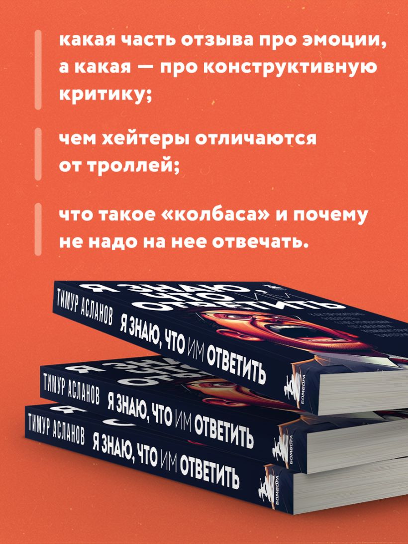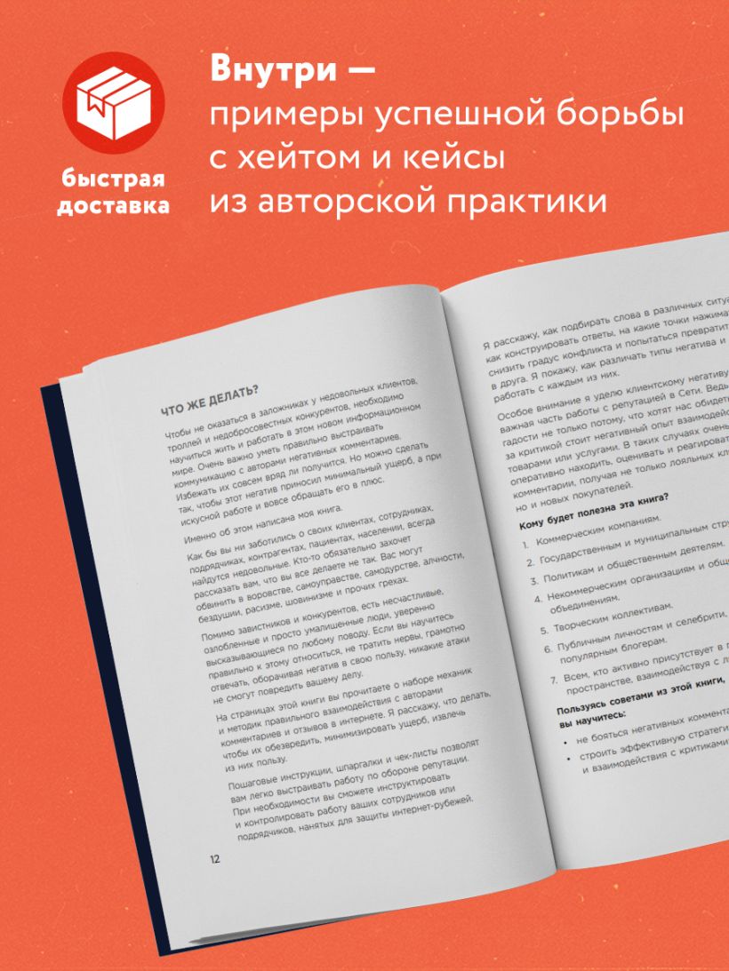Люди используют отзывы в Сети как оружие против тех, кто им не нравится. Тимур Асланов рассказывает, как от этого защититься и даже улучшить с их помощью свой имидж. Автор делится понятными инструментами, сопровождает их примерами и кейсами из практики — в общем, дает инструкцию по борьбе с сетевым негативом.