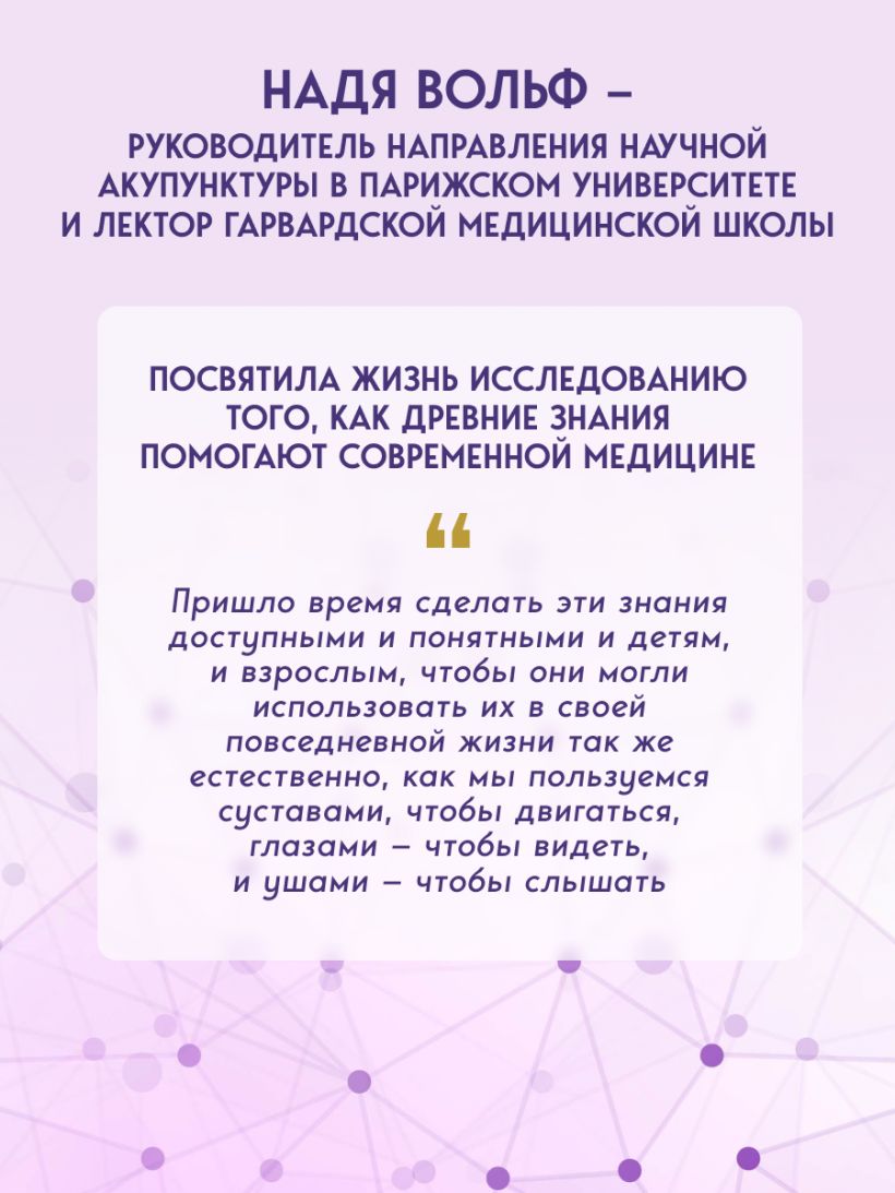 Надя Вольф — доктор медицинских наук, руководитель направления научной акупунктуры в Парижском Университете, член Ассоциации Научной Акупунктуры Франции и Американской Академии Медицинской Акупунктуры, лектор Гарвардской медицинской школы. Уже почти 50 лет она является признанным международным экспертом, обучая своему уникальному подходу.