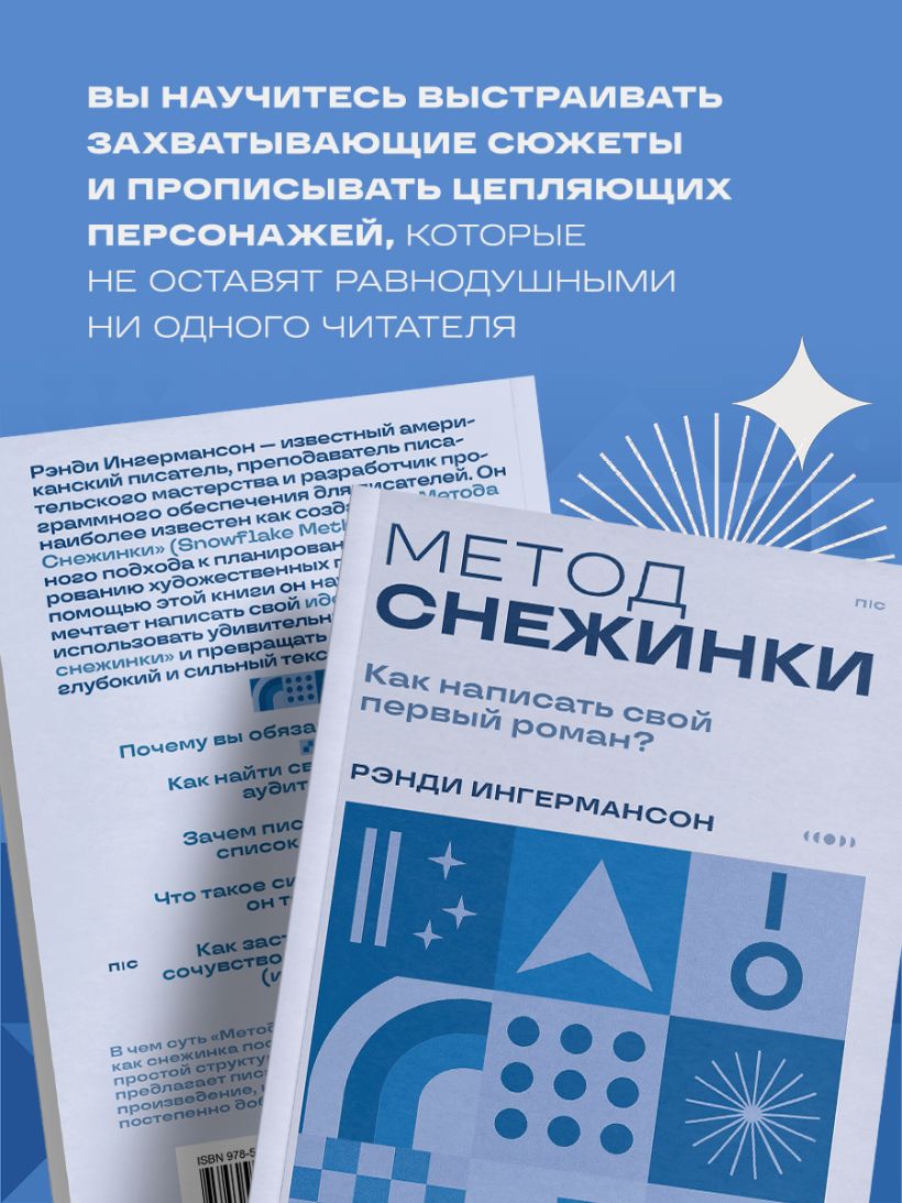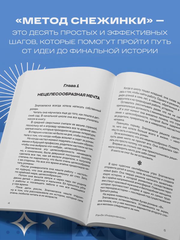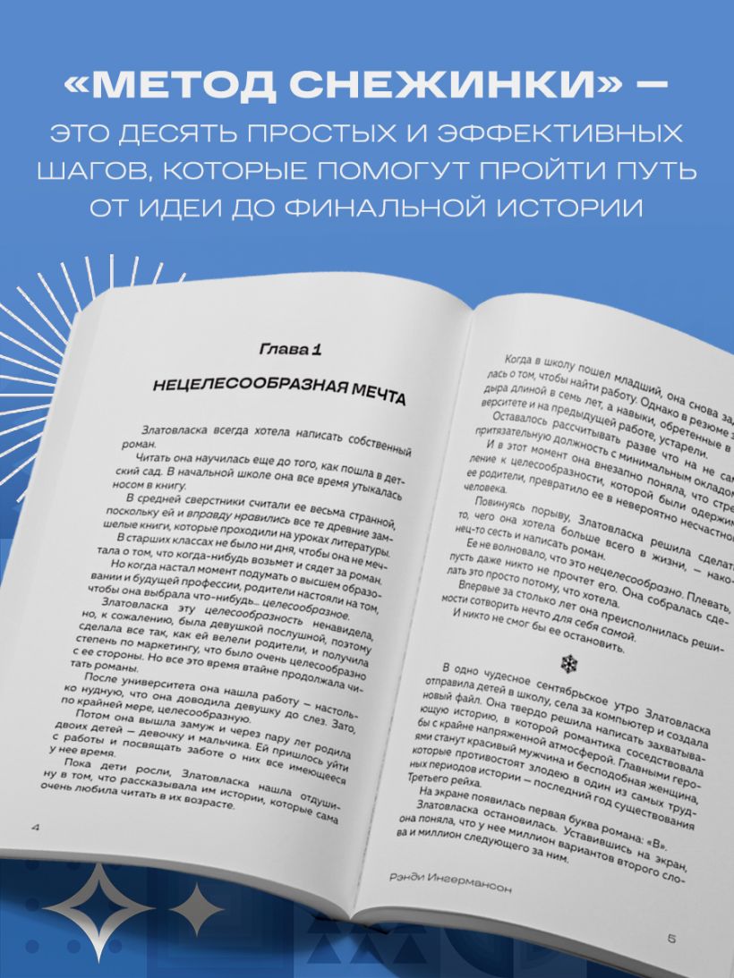 «Метод Снежинки» — это десять простых и эффективных шагов, которые помогут пройти путь от идеи до финальной истории. Вы увидите, как ваша задумка превращается в полноценный роман, а процесс написания становится интересным и вдохновляющим. Как снежинка формируется из маленьких кристаллов воды, так и ваша книга состоит из сотен образов, мыслей и фраз. Их можно представить, упорядочить и создать идеальный роман.