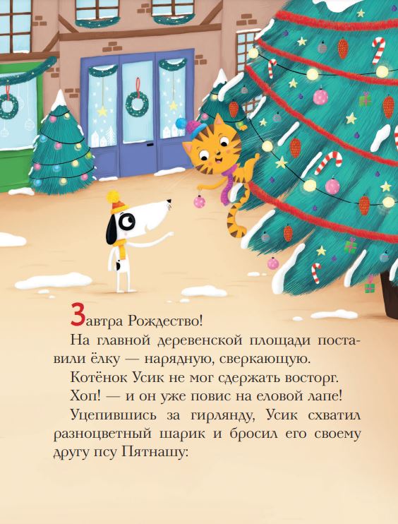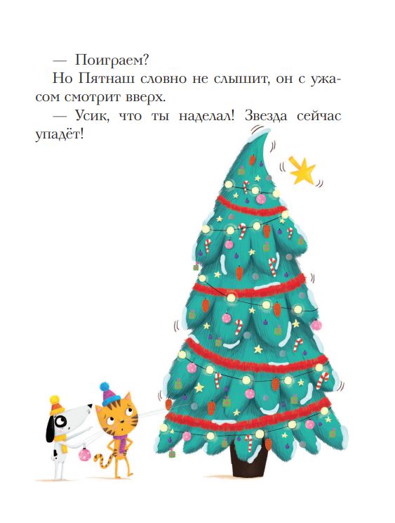 Как же так, только Усик хотел покачаться на ветках красивой рождественской елки, как самая красивая звезда разбилась? Котенок Усик и его друг пёс Пятнаш отправляются на поиски того, кто может помочь все исправить, и неожиданно попадают… к настоящему Санта-Клаусу.