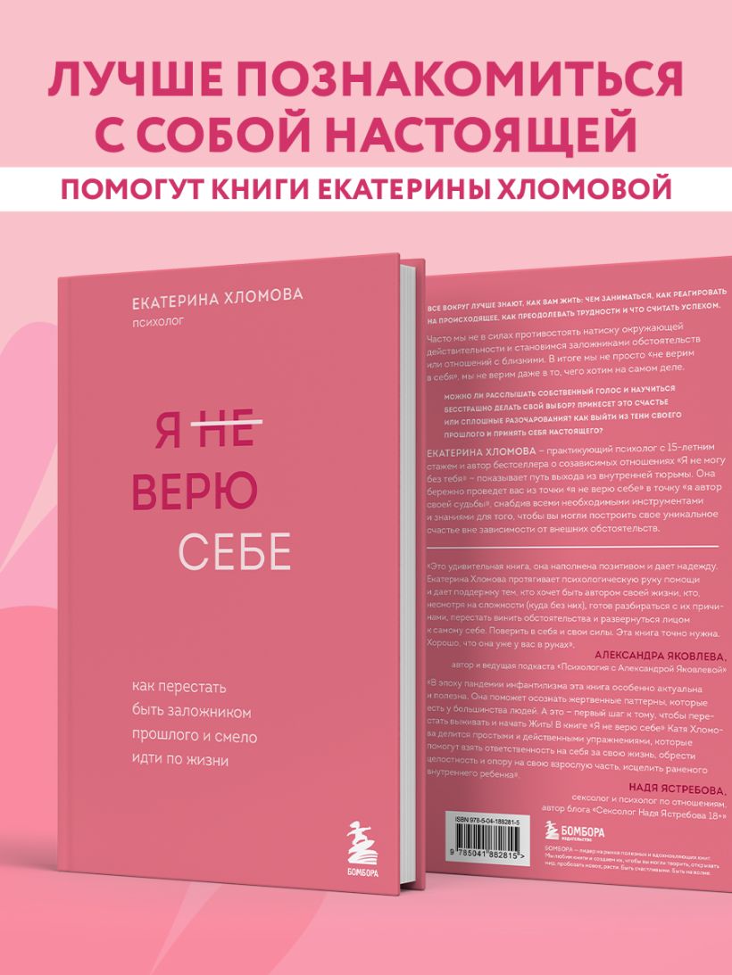 «В эпоху эпидемии инфантилизма эта книга особенно актуальна и полезна. Она поможет осознать жертвенные паттерны, которые есть у большинства людей. А это — первый шаг к тому, чтобы перестать выживать и начать Жить! В книге "Я не верю себе" Катя Хломова делится простыми и действенными упражнениями, которые помогут взять ответственность на себя за свою жизнь, обрести целостность и опору на свою взрослую часть, исцелить раненого внутреннего ребенка и стать Автором собственной счастливой и полноценной жизни». — Надя Ястребова, сексолог и психолог по отношениям, автор блога «Сексолог Надя Ястребова18+»