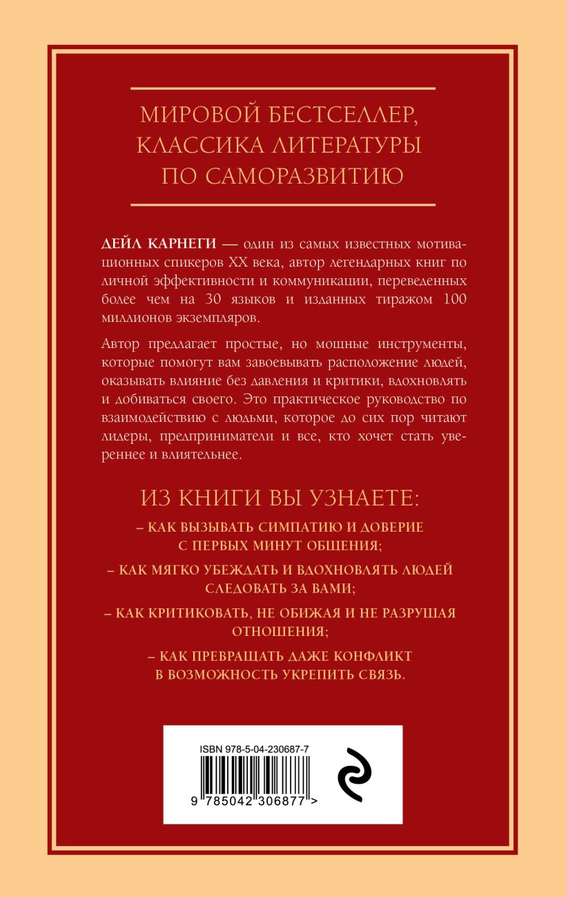Автор предлагает простые, но мощные инструменты, которые помогут вам завоевывать расположение людей, оказывать влияние без давления и критики, вдохновлять и добиваться своего. Это практическое руководство по взаимодействию с людьми, которое до сих пор читают лидеры, предприниматели и все, кто хочет стать увереннее и влиятельнее.