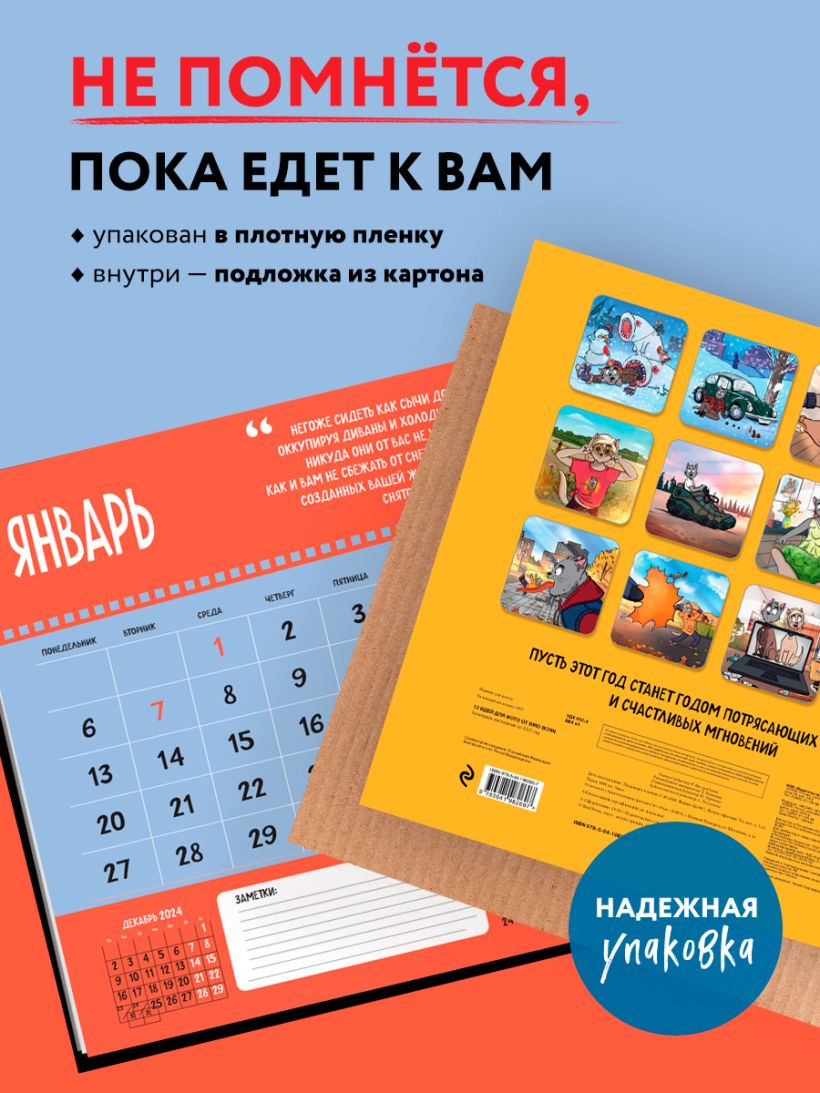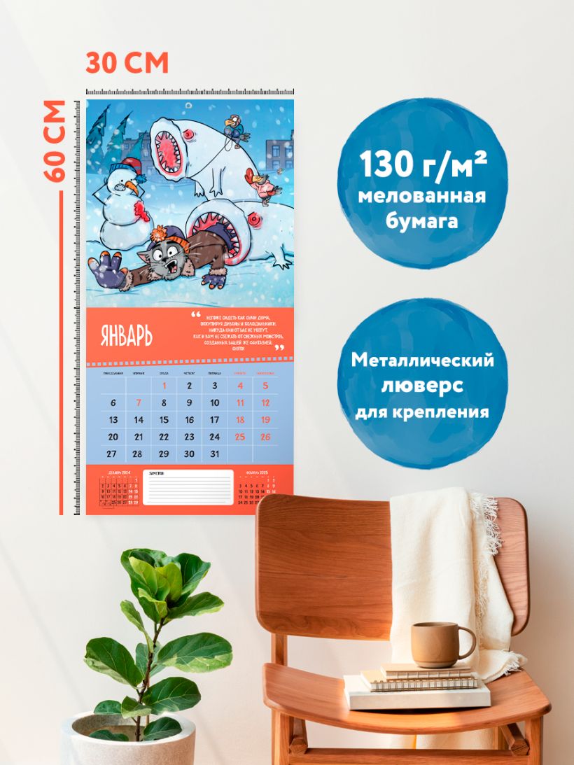 Практичный и забавный календарь будет радовать вас каждый день. Веселые идеи для фото в исполнении персонажей художника органично дополнят любой интерьер и помогут грамотно спланировать свой день, неделю, месяц и год.