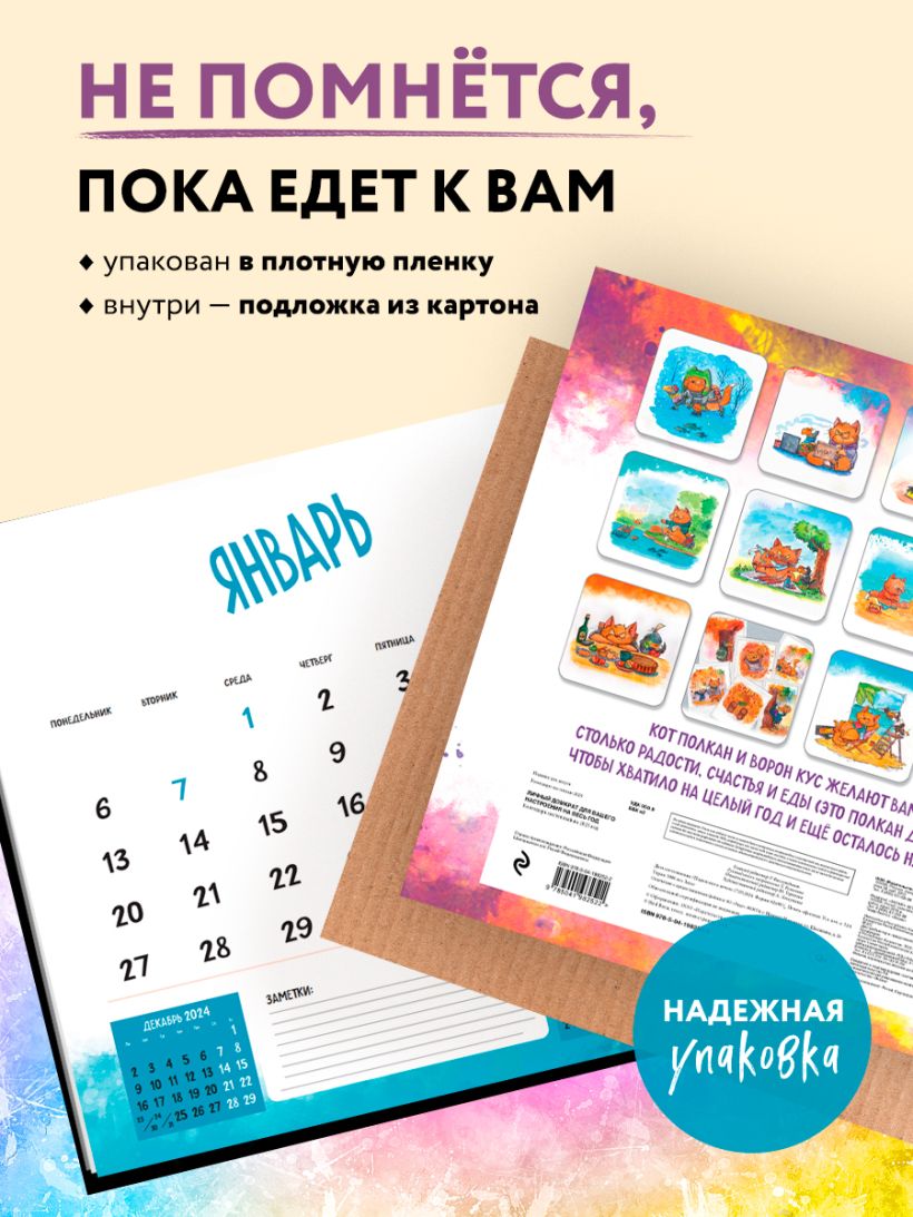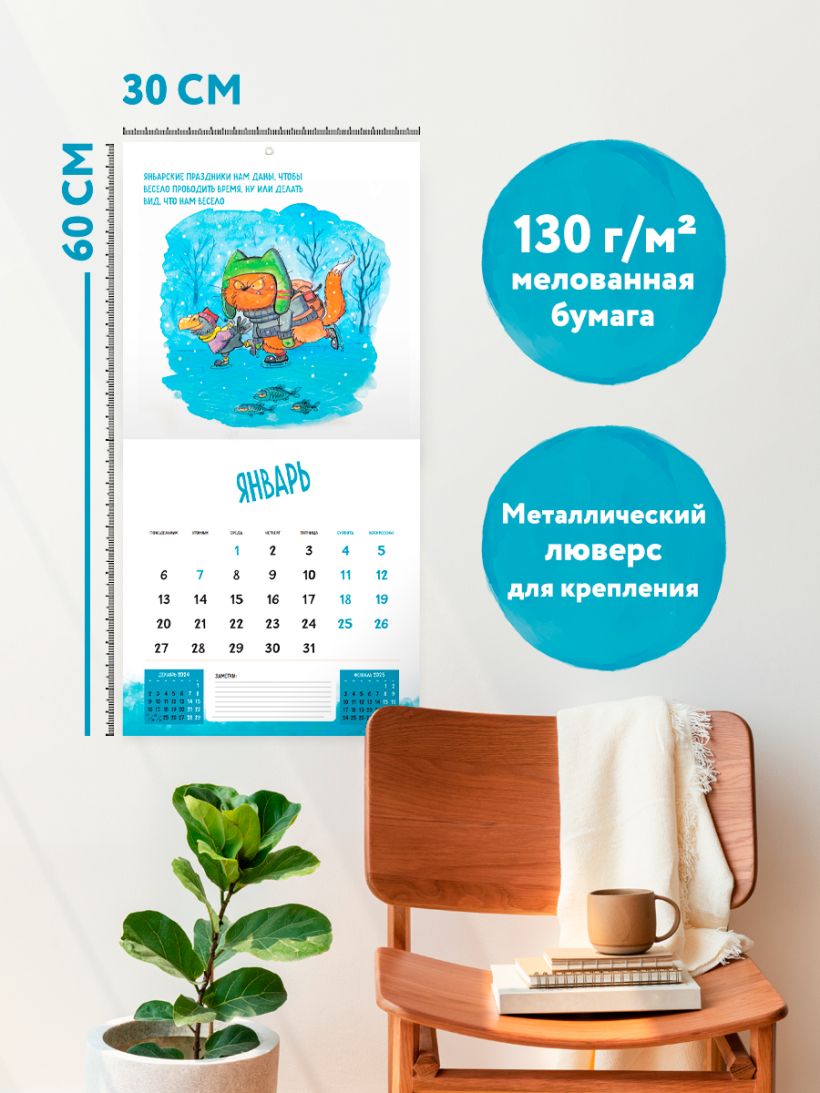 Практичный и красивый календарь будет радовать вас каждый день. Персонажи художника будут каждый месяц мотивировать вас забавными фразами и органично дополнят любой интерьер и помогут грамотно спланировать свой день, неделю, месяц и год.