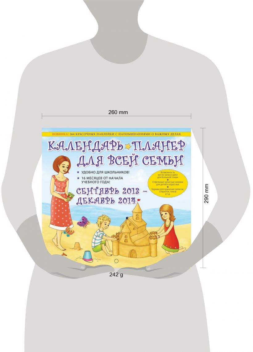 Прекрасно иллюстрированный и удобный календарь-планнер, записи в котором могут вести одновременно несколько человек. Идеально для школьников и их родителей: календарь рассчитан на 16 месяцев с начала учебного года ( с сентября 2013 г. по декабрь 2014 г.). Отдельные записные книжки для детей и взрослых. Удобный карман для хранения записок, открыток, чеков и пр. Впервые: 264 красочные наклейки с напоминаниями о важных делах.