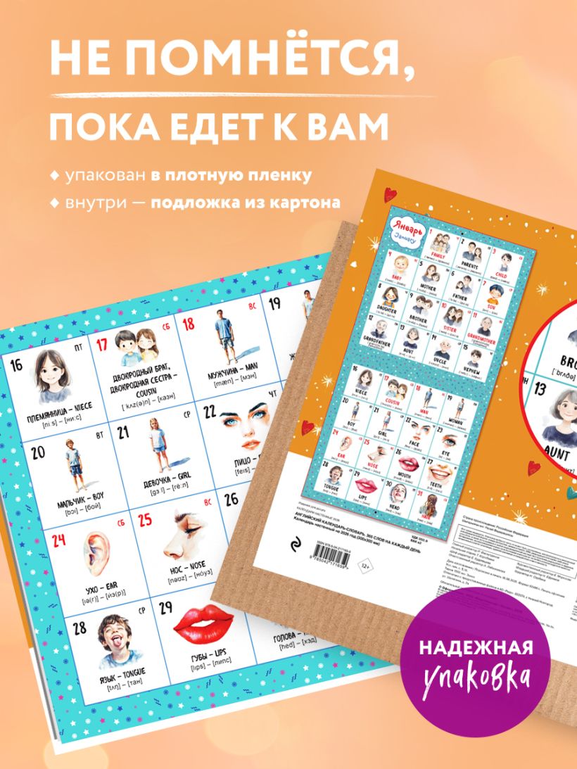 Этот календарь поможет вашему ребенку плавно и с интересом погружаться в мир английского языка — день за днем, слово за словом. Без зубрежки и скуки. А с помощью красочных иллюстраций ребенок будет легко запоминать английские слова.
