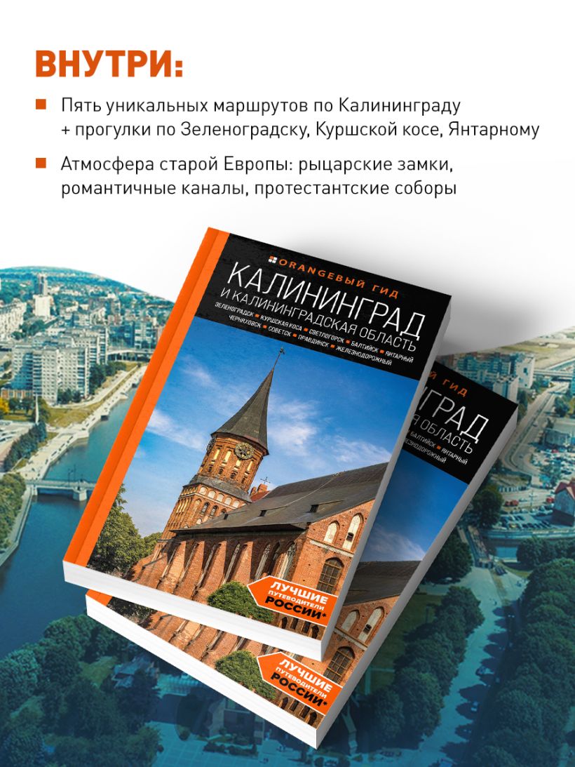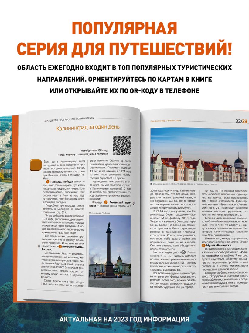 В нем содержится актуальная и полезная информация о Калининграде и его окрестностях, различные маршруты на любой вкус и приятное дополнение в виде QR-кодов, с помощью которых вы сможете открыть маршрут прямо у себя в телефоне, а также множество полезных советов от автора и местного гида Марины Железовой.