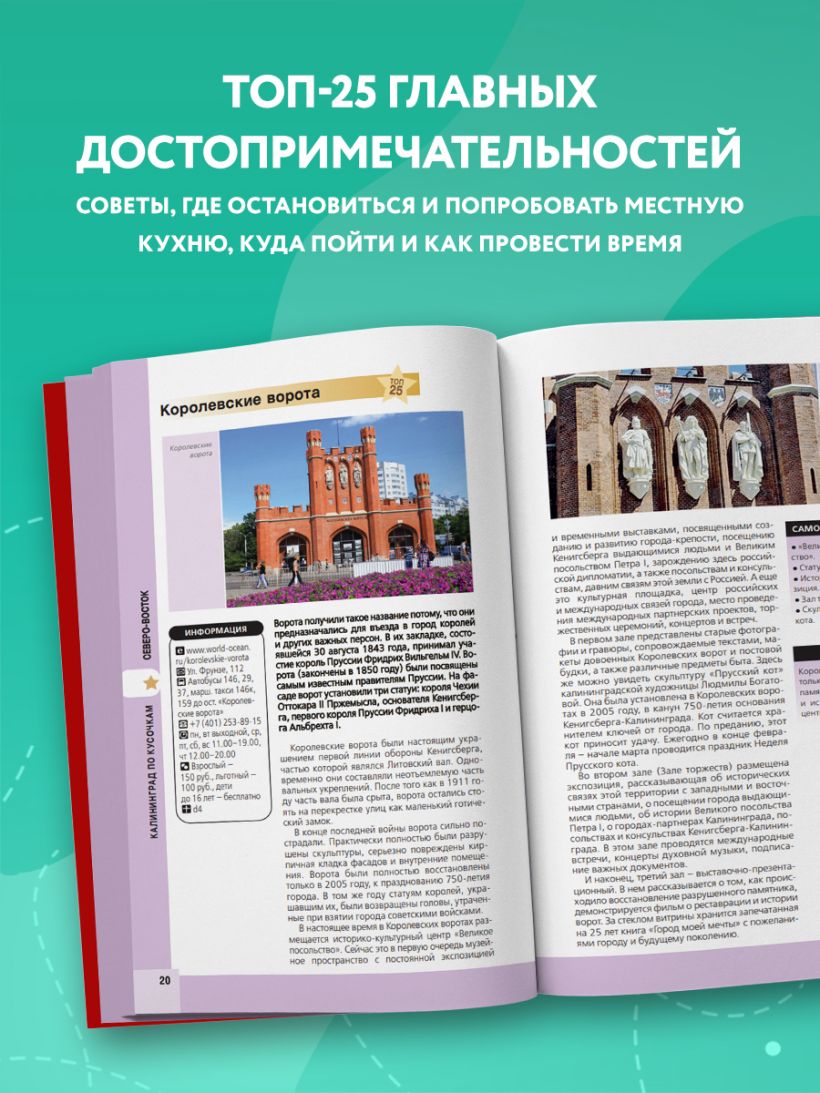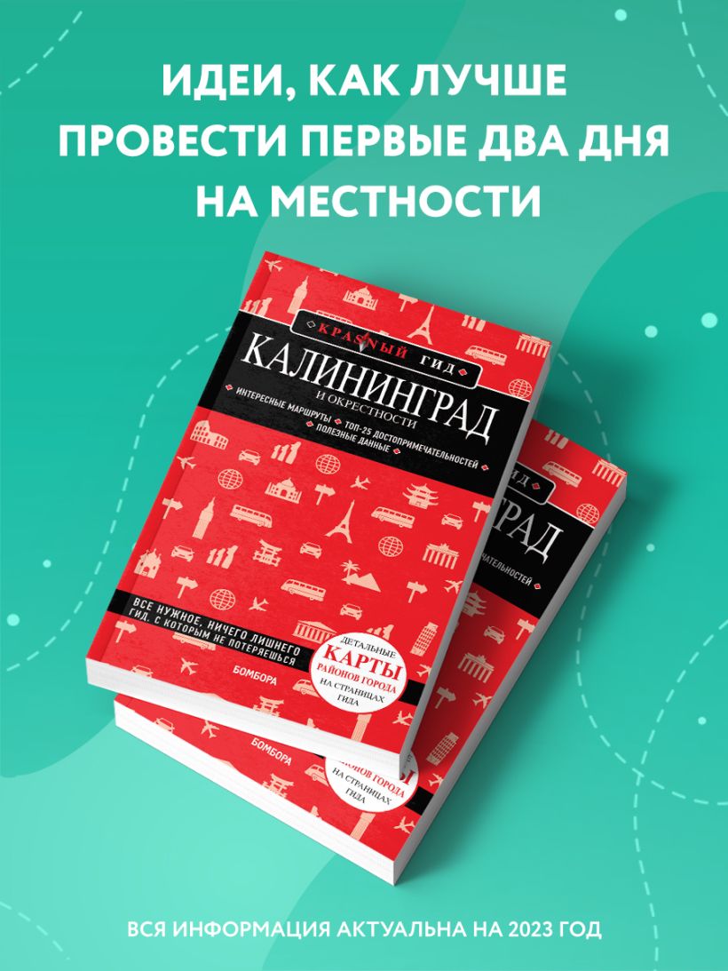 Перед вами гид по Калининграду — одному из самых популярных направлений этого года. В нем содержится актуальная и полезная информация о городе и его окрестностях, советы, как лучше провести первый и второй дни, куда сходить, а также Топ-25 главных достопримечательностей. В путеводителе вы найдете описания самых интересных мест в Калининграде, Зеленоградске и Светлогорске, а сориентироваться на местности вам помогут готовые маршруты и удобные карты, расположенные на страницах гида. Вся необходимая информация о том, где остановиться и попробовать кухню, куда пойти и как провести время, всегда доступна с серией путеводителей «Красный гид», которые удобно брать с собой в поездку. Калининград и его окрестности ежегодно входят в пятерку самых популярных туристических направлений. Основными причинами этого являются удивительная история Калининграда, неповторимая архитектура и то, что Калининградская область имеет выход на побережье Балтийского моря с мягким умеренным климатом, широкими песчаными пляжами и известными курортами — Светлогорским, Зеленоградским, Янтарным. А еще здесь есть Куршская коса с песчаными дюнами, «Танцующим лесом», великолепной рыбалкой и даже серфингом. Вся информация актуальна на 2025 год.