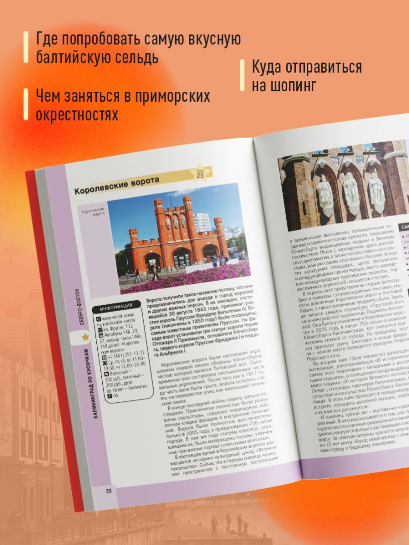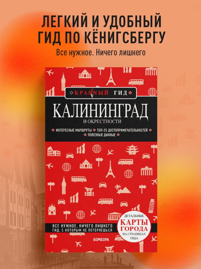 Перед вами гид по Калининграду — одному из самых популярных направлений этого года. В нем содержится актуальная и полезная информация о городе и его окрестностях, советы, как лучше провести первый и второй дни, куда сходить, а также Топ-25 главных достопримечательностей. В путеводителе вы найдете описания самых интересных мест в Калининграде, Зеленоградске и Светлогорске, а сориентироваться на местности вам помогут готовые маршруты и удобные карты, расположенные на страницах гида. Вся необходимая информация о том, где остановиться и попробовать кухню, куда пойти и как провести время, всегда доступна с серией путеводителей «Красный гид», которые удобно брать с собой в поездку. Калининград и его окрестности ежегодно входят в пятерку самых популярных туристических направлений. Основными причинами этого являются — удивительная история Калининграда, неповторимая архитектура и то, что Калининградская область имеет выход на побережье Балтийского моря с мягким умеренным климатом, широкими песчаными пляжами и известными курортами — Светлогорским, Зеленоградским, Янтарным. А еще здесь есть Куршская коса с песчаными дюнами, «Танцующим лесом», великолепной рыбалкой и даже серфингом. Вся информация актуальна на 2023 год.
