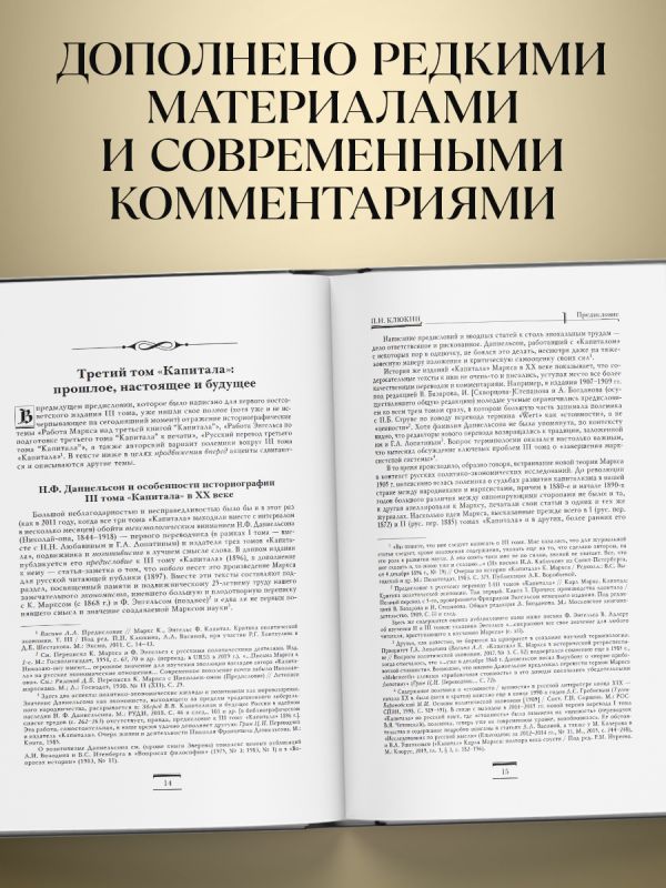 В книгу добавлены также отдельные подразделы, раскрывающие многогранность и сложность проблемного поля III тома «Капитала». Один подраздел посвящен памяти и труду замечательного нашего переводчика «Капитала» и экономиста Н.Ф. Даниельсона (1844—1918), впервые представившего текст III тома русской публике в 1896 г. Второй подраздел образует крайне малоизвестный в России текст 1905 г. одного из самых глубоких представителей тогдашнего ревизионизма Эд. Бернштейна (1850—1932). Третий подраздел составлен из классики количественной трактовки I и III томов «Капитала» — перевода оригинальной статьи 1907 г. (с ее современным осмыслением) видного представителя российской аналитической традиции, статистика и экономиста с мировым именем В.И. Борткевича (1868—1931).