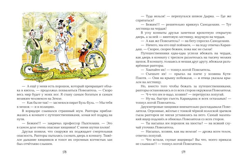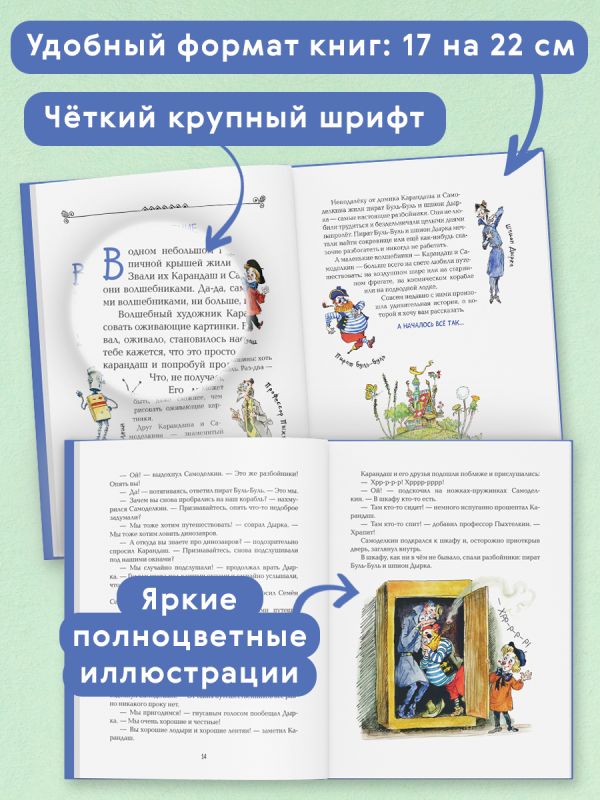 УВЛЕКАТЕЛЬНЫЕ, ПОЗНАВАТЕЛЬНЫЕ, ЯРКИЕ СОВРЕМЕННЫЕ СКАЗКИ С ИЛЛЮСТРАЦИЯМИ ВЫДАЮЩЕГОСЯ МАСТЕРА АНАТОЛИЯ ЕЛИСЕЕВА! Издание удобного формата. Твёрдый переплёт с частичным лаком. Белая бумага. Чёткий, удобный для чтения шрифт. Яркие полноцветные иллюстрации. Мегапопулярные герои отечественной детской классики — волшебный художник Карандаш и железный мастер на все руки Самоделкин — рады новым встречам с читателями всех возрастов! В небольшом городе на берегу реки происходит что-то странное. По улицам едет машина с подушками вместо колёс. В жаркий летний день трава покрывается снегом. У пристани появляется прекрасный парусный корабль, а к нему подбираются страшные разбойники. Кто же всё это натворил? И кому грозит ужасная опасность?.. Больше полувека назад писатель Юрий Дружков рассказал об удивительных событиях, происходивших с весёлыми человечками, в своих книгах «Приключения Карандаша и Самоделкина» и «Волшебная школа Карандаша и Самоделкина». Затем эстафету весёлых приключений принял сын Юрия Дружкова, известный детский писатель Валентин Постников. Благодаря его неистощимой фантазии любимые герои побывают в самых необыкновенных уголках Земли и в космосе, встретятся с динозаврами и даже… поймают привидение! А читатели убедятся, что Валентина Постникова совершенно справедливо называют «самым весёлым современным сказочником». Главной «изюминкой» этих книг стали яркие, остроумные, изящные иллюстрации известнейшего советского и российского художника Анатолия Михайловича Елисеева.
