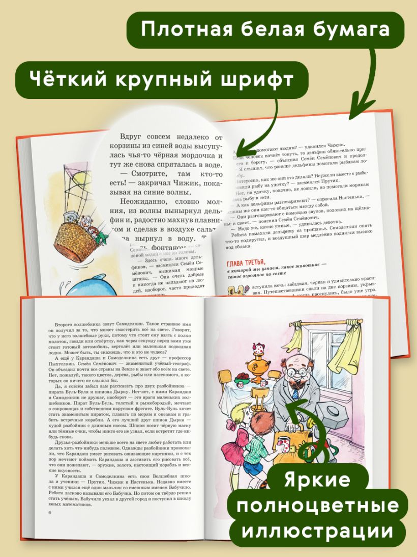 УВЛЕКАТЕЛЬНЫЕ, ПОЗНАВАТЕЛЬНЫЕ, ЯРКИЕ СОВРЕМЕННЫЕ СКАЗКИ С ИЛЛЮСТРАЦИЯМИ ВЫДАЮЩЕГОСЯ МАСТЕРА АНАТОЛИЯ ЕЛИСЕЕВА! Издание удобного формата. Твёрдый переплёт с частичным лаком. Белая бумага. Чёткий, удобный для чтения шрифт. Яркие полноцветные иллюстрации. Мегапопулярные герои отечественной детской классики — волшебный художник Карандаш и железный мастер на все руки Самоделкин — рады новым встречам с читателями всех возрастов! Можно ли выучиться на волшебника? Конечно, можно, если ходить в Волшебную школу! Найти её очень просто: она находится в небольшом городе посреди тропического леса. Из её окон доносятся весёлый смех и звонкие крики, а во дворе гуляют коза в цветочек и кот в зелёную клеточку. Больше полувека назад писатель Юрий Дружков рассказал об удивительных событиях, происходивших с весёлыми человечками, в своих книгах «Приключения Карандаша и Самоделкина» и «Волшебная школа Карандаша и Самоделкина». Затем эстафету весёлых приключений принял сын Юрия Дружкова, известный детский писатель Валентин Постников. Благодаря его неистощимой фантазии любимые герои побывают в самых необыкновенных уголках Земли и в космосе, встретятся с динозаврами и даже… поймают привидение! А читатели убедятся, что Валентина Постникова совершенно справедливо называют «самым весёлым современным сказочником». Главной «изюминкой» этих книг стали яркие, остроумные, изящные иллюстрации известнейшего советского и российского художника Анатолия Михайловича Елисеева.