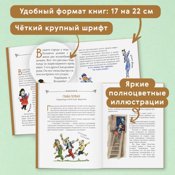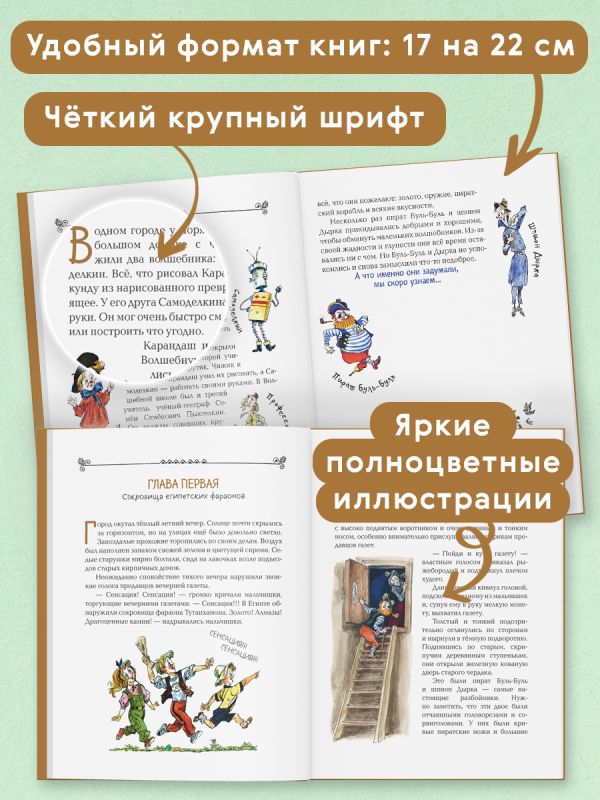 УВЛЕКАТЕЛЬНЫЕ, ПОЗНАВАТЕЛЬНЫЕ, ЯРКИЕ СОВРЕМЕННЫЕ СКАЗКИ С ИЛЛЮСТРАЦИЯМИ ВЫДАЮЩЕГОСЯ МАСТЕРА АНАТОЛИЯ ЕЛИСЕЕВА! Издание удобного формата. Твёрдый переплёт с частичным лаком. Белая бумага. Чёткий, удобный для чтения шрифт. Яркие полноцветные иллюстрации. Мегапопулярные герои отечественной детской классики — волшебный художник Карандаш и железный мастер на все руки Самоделкин — рады новым встречам с читателями всех возрастов! В небольшом городе на берегу реки происходит что-то странное. По улицам едет машина с подушками вместо колёс. В жаркий летний день трава покрывается снегом. У пристани появляется прекрасный парусный корабль, а к нему подбираются страшные разбойники. Кто же всё это натворил? И кому грозит ужасная опасность?.. Больше полувека назад писатель Юрий Дружков рассказал об удивительных событиях, происходивших с весёлыми человечками, в своих книгах «Приключения Карандаша и Самоделкина» и «Волшебная школа Карандаша и Самоделкина». Затем эстафету весёлых приключений принял сын Юрия Дружкова, известный детский писатель Валентин Постников. Благодаря его неистощимой фантазии любимые герои побывают в самых необыкновенных уголках Земли и в космосе, встретятся с динозаврами и даже… поймают привидение! А читатели убедятся, что Валентина Постникова совершенно справедливо называют «самым весёлым современным сказочником». Главной «изюминкой» этих книг стали яркие, остроумные, изящные иллюстрации известнейшего советского и российского художника Анатолия Михайловича Елисеева.
