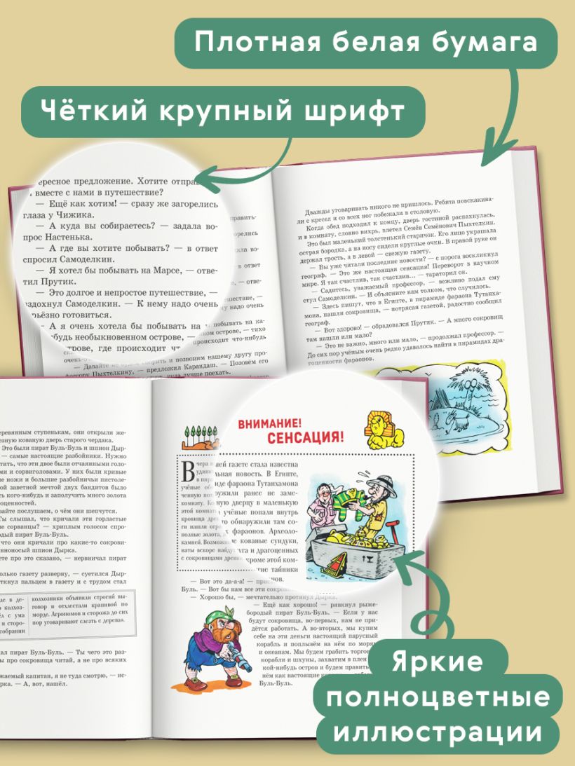 УВЛЕКАТЕЛЬНЫЕ, ПОЗНАВАТЕЛЬНЫЕ, ЯРКИЕ СОВРЕМЕННЫЕ СКАЗКИ С ИЛЛЮСТРАЦИЯМИ ВЫДАЮЩЕГОСЯ МАСТЕРА АНАТОЛИЯ ЕЛИСЕЕВА! Издание удобного формата. Твёрдый переплёт с частичным лаком. Белая бумага. Чёткий, удобный для чтения шрифт. Яркие полноцветные иллюстрации. Мегапопулярные герои отечественной детской классики — волшебный художник Карандаш и железный мастер на все руки Самоделкин — рады новым встречам с читателями всех возрастов! В небольшом городе на берегу реки происходит что-то странное. По улицам едет машина с подушками вместо колёс. В жаркий летний день трава покрывается снегом. У пристани появляется прекрасный парусный корабль, а к нему подбираются страшные разбойники. Кто же всё это натворил? И кому грозит ужасная опасность?.. Больше полувека назад писатель Юрий Дружков рассказал об удивительных событиях, происходивших с весёлыми человечками, в своих книгах «Приключения Карандаша и Самоделкина» и «Волшебная школа Карандаша и Самоделкина». Затем эстафету весёлых приключений принял сын Юрия Дружкова, известный детский писатель Валентин Постников. Благодаря его неистощимой фантазии любимые герои побывают в самых необыкновенных уголках Земли и в космосе, встретятся с динозаврами и даже… поймают привидение! А читатели убедятся, что Валентина Постникова совершенно справедливо называют «самым весёлым современным сказочником». Главной «изюминкой» этих книг стали яркие, остроумные, изящные иллюстрации известнейшего советского и российского художника Анатолия Михайловича Елисеева.