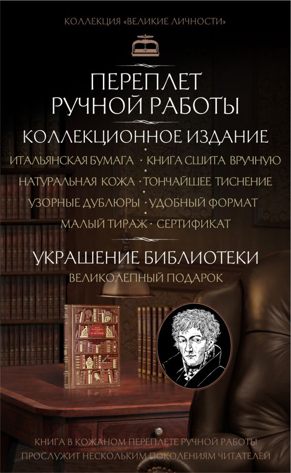 Коллекционное издание в серии «Великие личности», включающей в себя 21 том знаменитых сочинений крупнейших философов, ученых, писателей и военачальников прошлых веков и нового времени в популярном изложении. Издание в переплёте ручной работы отпечатано на бумаге премиум-класса цвета чайной розы и сшито вручную. Заявленный тираж 2020 года - 15 нумерованных экземпляров. В каждом экземпляре - избранные цитаты и гравированный портрет автора, отпечатанные на дизайнерской бумаге, изготовленной на четверть из натуральной кожи. Переплеты созданы по традиционной для 19 века технологии из гладкой натуральной кожи и украшены тремя видами рельефного тиснения - золотым. рельефным и красочным. Форзацы книги из дизайнерской тонированной бумаги и тиснёные золотом орнаментальные дублюры. Каптал и ляссе из шелка и трехсторонний торшонированный обрез.