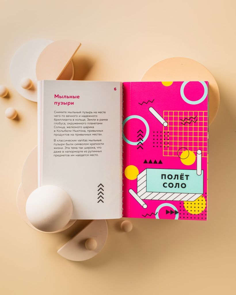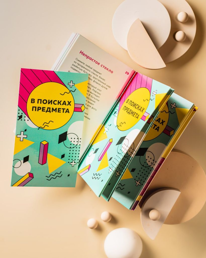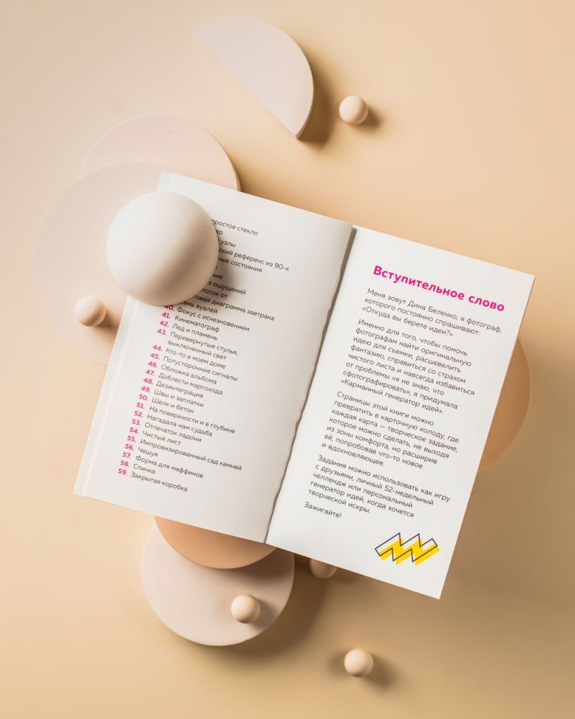 В книге «Карманный генератор идей» 52 карточки, которые легко отрываются по перфорации. На каждой из них — творческое задание от Дины с различными предметами, которые вы легко найдете дома или на улице. Самые простые темы сосредоточены вокруг одного реквизита, а самые сложные уровни предложат вам, например, показать исчезнувший предмет или передать ощущение чужого присутствия на фото.