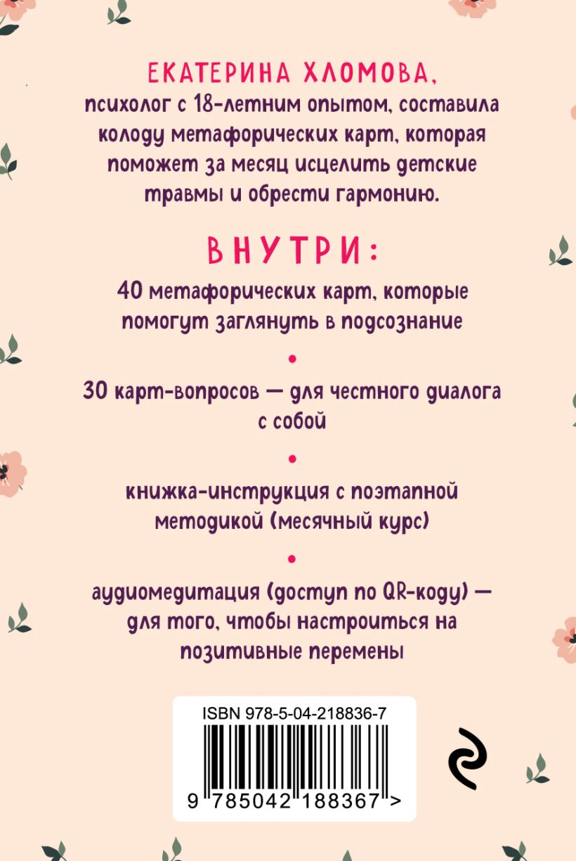 Екатерина Хломова, психолог с 18-летним опытом, составила колоду метафорических карт, которая поможет за месяц исцелить детские травмы и обрести гармонию. Она будет поддерживать вас на всем пути, пока вы не обретете навык самоподдержки. Ее цель не просто указать вам на ваши травмы, а показать способы жить без их влияния.