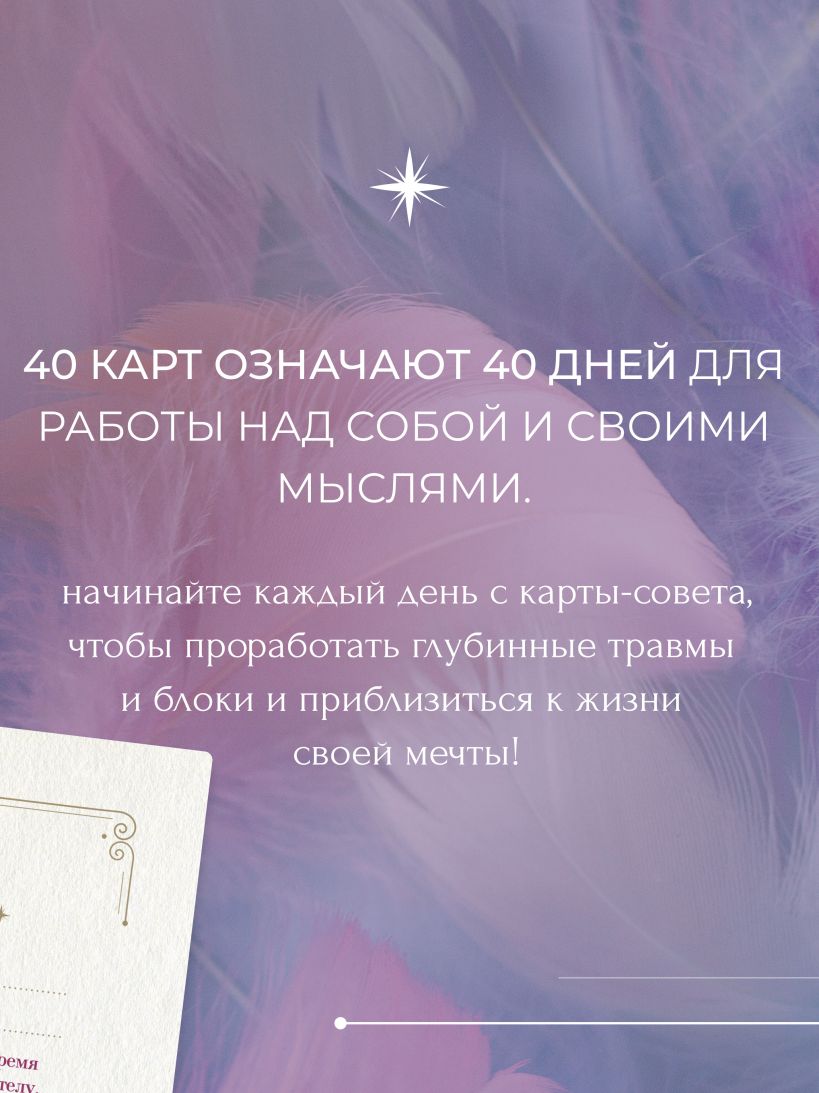40 карт означают 40 твоих шагов к самой себе — настоящей, счастливой, богатой, любимой, здоровой, реализованной. Совершай каждый день новый шаг, прислушиваясь к посланию ангела в вытянутой карте, и приближайся к жизни своей мечты!