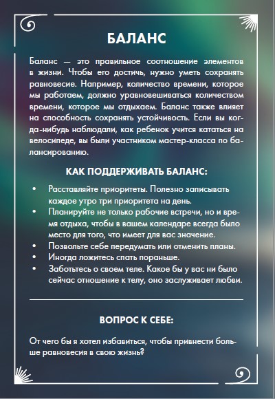 - Внутри — задания и практики, которые позволят развить желаемые качества и научиться управлять своим состоянием.