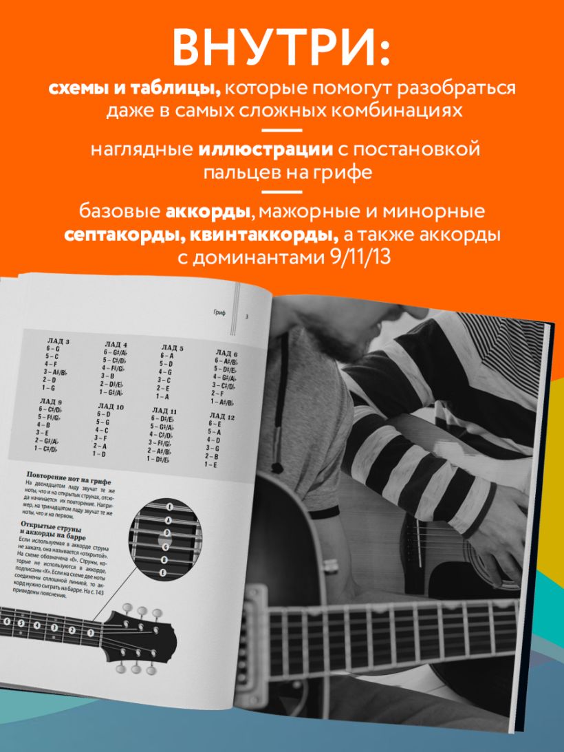 - аппликатуры самых популярных аккордов: от базовых аккордов до септаккордов и квинтаккордов;