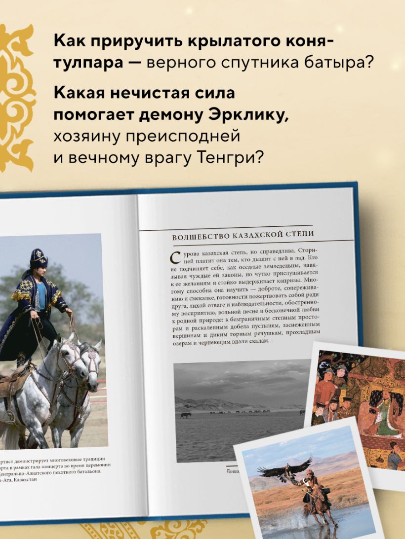 Как приручить крылатого коня-тулпара — верного спутника батыра? Что общего у легенды о поэте Асане Кайгы и его возлюбленной пери-лебеди и скандинавскими сагами? И как выглядит демон Эрклик — хозяин преисподней и вечный враг Тенгри?