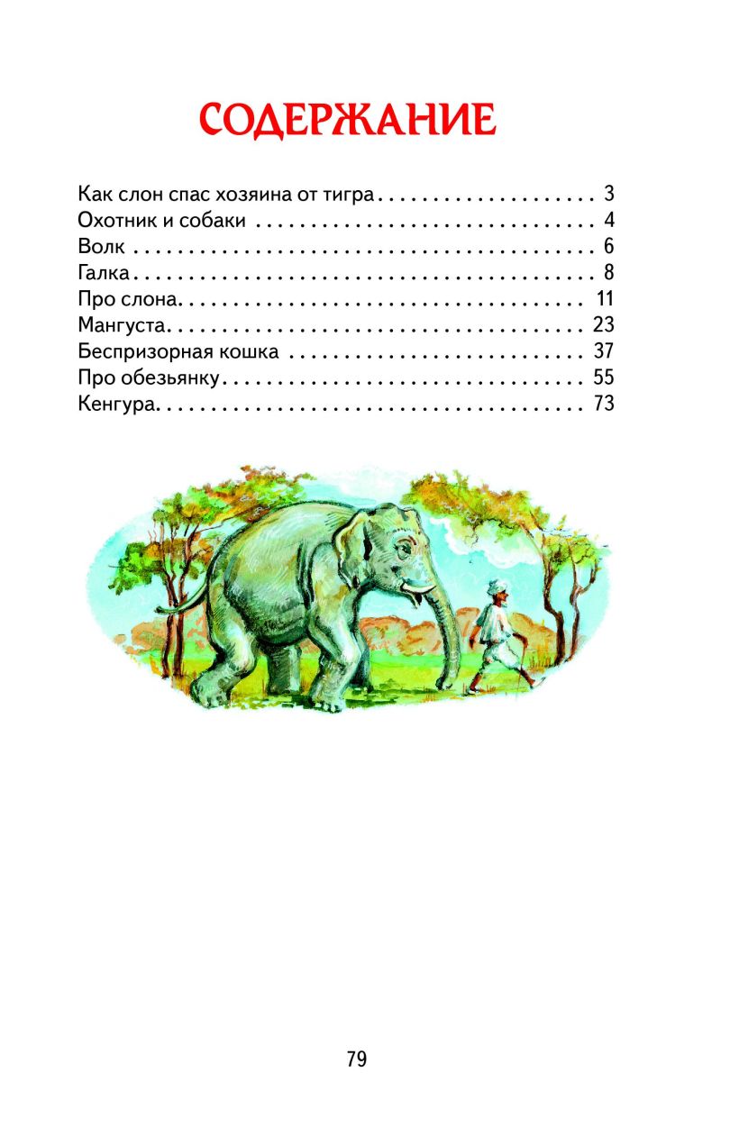 В книгу вошло 9 рассказов Бориса Житкова о животных: «Как слон спас хозяина от тигра», «Охотник и собаки», «Про слона» и другие. Их персонажи — слон, мангуст, обезьянка, тигр и волк — написаны буквально с натуры, ярко и красочно, ведь автор рассказов не только известный детский писатель, но и путешественник.