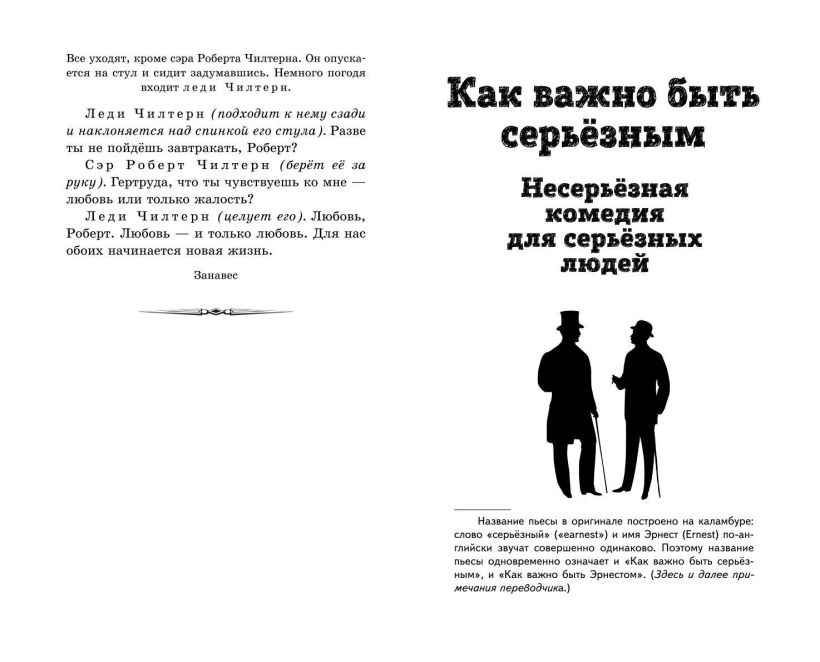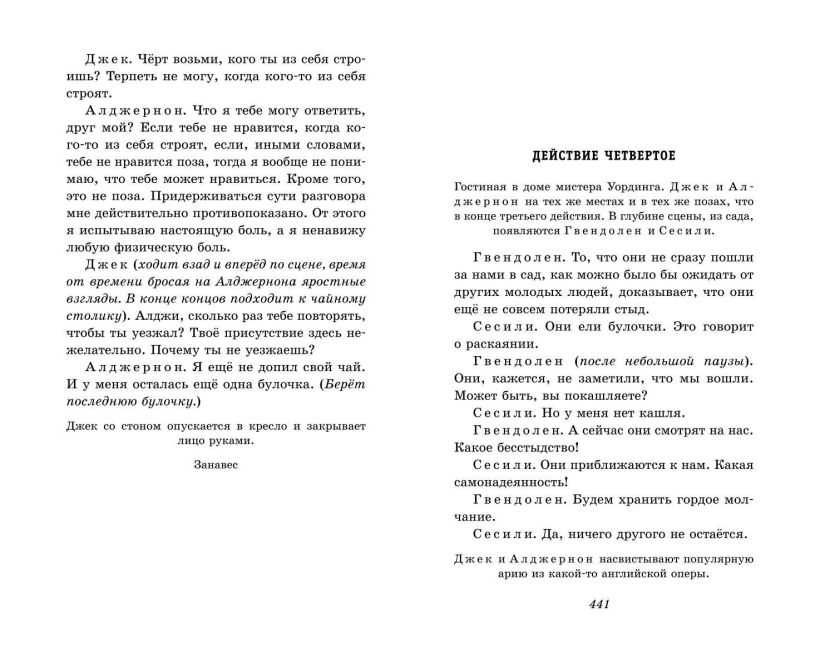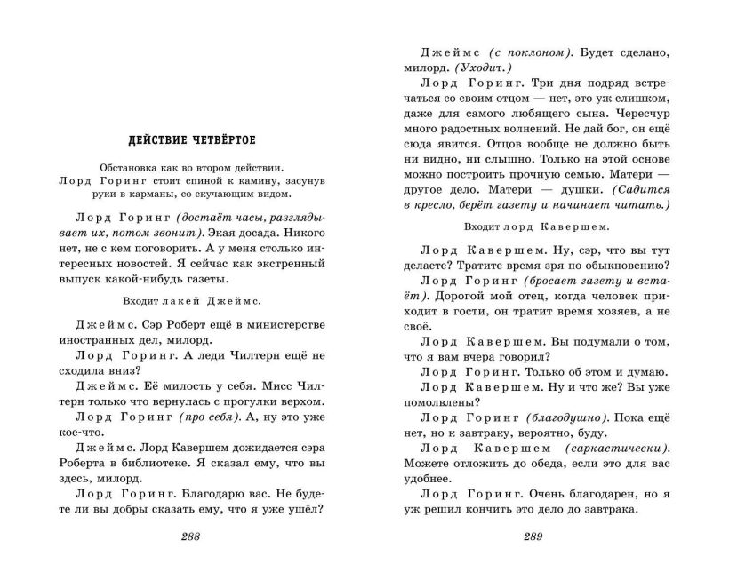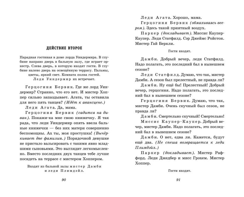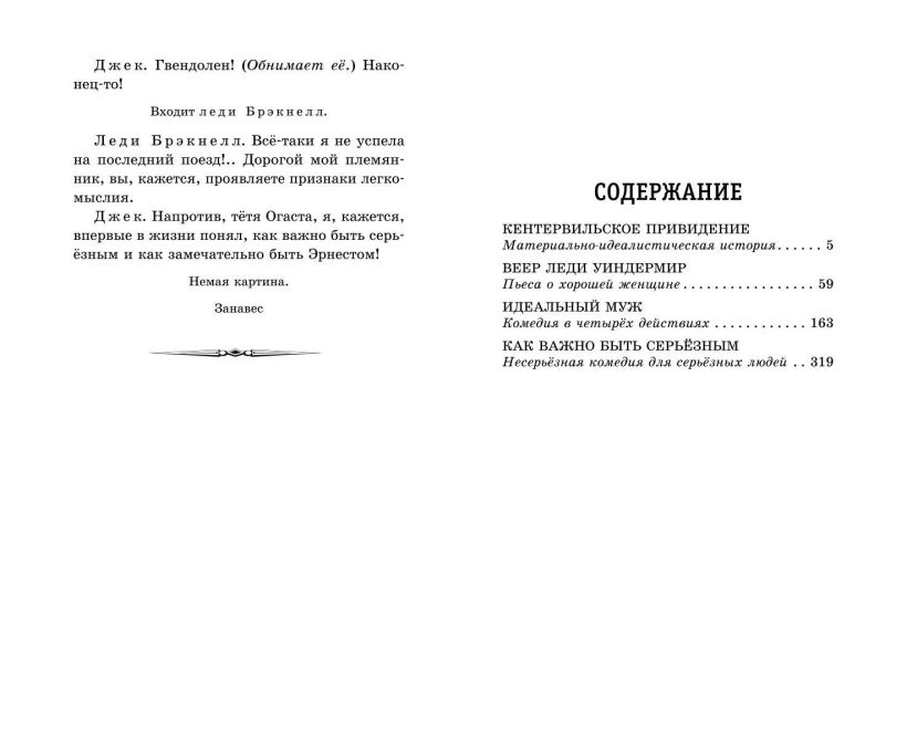 Остроумные и динамичные пьесы О. Уайльда «Веер леди Уиндермир» (перевод Марии Лорие), «Идеальный муж» (перевод Ольги Холмской), «Как важно быть серьёзным» (перевод Ивана Кашкина) безжалостно высмеивают предрассудки и пороки, но всегда приходят к счастливому финалу. Они с неизменным успехом ставятся на театральных подмостках и экранизируются во всём мире.