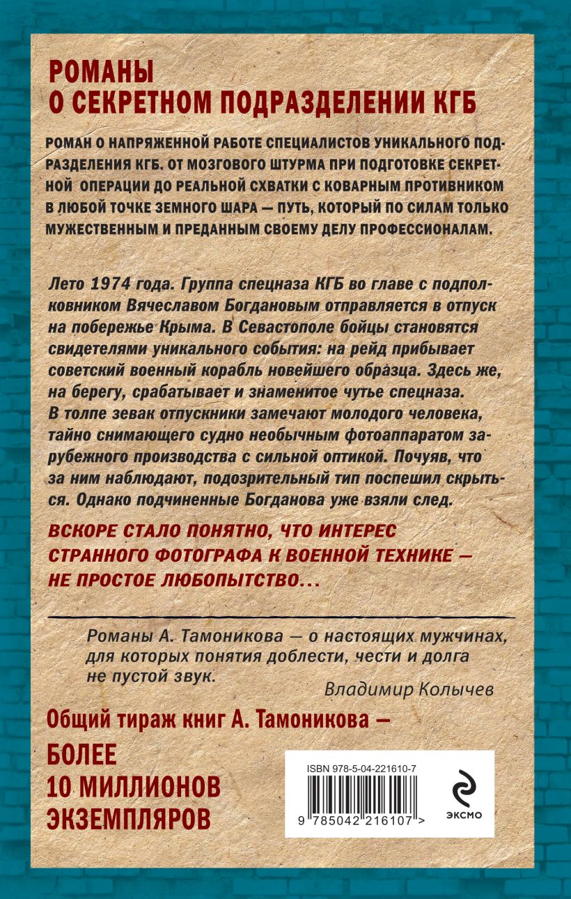 1978 год. «Холодная война» в самом разгаре. В Пакистане, тяготеющем к Западу, завершается строительство современного танкового завода. Это может заметно изменить баланс сил в регионе. Советское руководство принимает решение — уничтожить объект любой ценой. Операция поручена группе спецназа КГБ майора Иваницкого. Однако, перейдя границу, бойцы попадают в ловушку, организованную предателем, и оказываются в секретной тюрьме. Но они не теряют надежды на спасение: поднимают бунт и укрываются в крепостной башне... В Москве становится известно о восстании. На помощь узникам направляется отряд спецназа подполковника Вячеслава Богданова. Найти и освободить товарищей в безлюдной пустыне — задача не из легких. Но опытные бойцы готовы к встрече с любыми обстоятельствами… Роман о напряженной работе специалистов уникального подразделения КГБ. От мозгового штурма при подготовке секретной операции до реальной схватки с коварным противником в любой точке земного шара — путь, который по силам только мужественным и преданным своему делу профессионалам. «Романы А. Тамоникова — о настоящих мужчинах, для которых понятия доблести, чести и долга — не пустой звук». — В. Колычев Общий тираж книг А. Тамоникова — более 10 миллионов экземпляров.