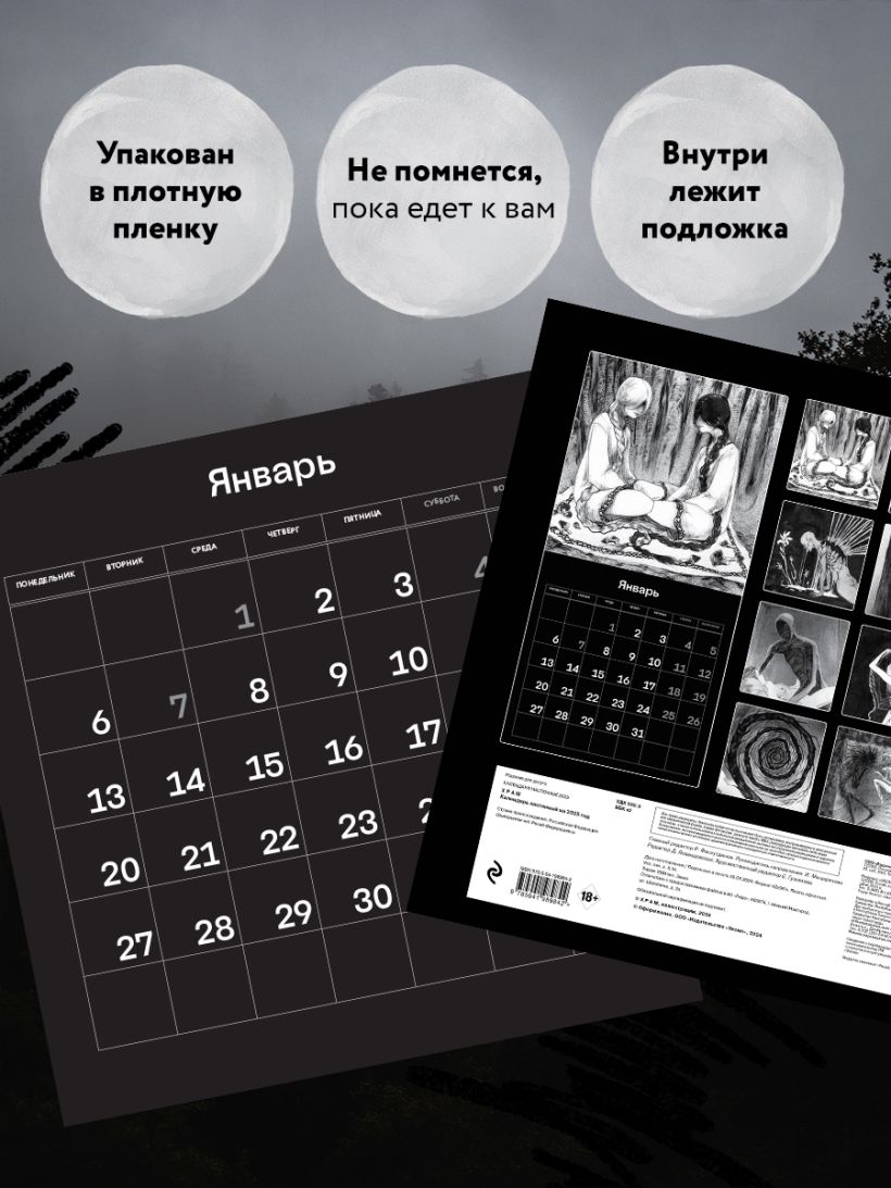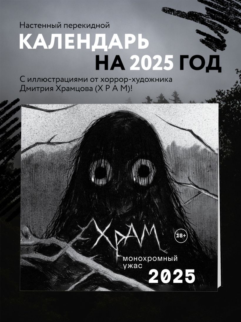 Самый атмосферный календарь нового года! Внутри календаря — сетка с основными праздниками и местом для записи важных событий, а также 12 авторских иллюстраций от хоррор-художника Дмитрия Храмцова (Х Р А М)! Удобный формат 300х300 мм позволит повесить его абсолютно везде, а утонченные портреты дев и монохромные чудовища будут вдохновлять вас целый год!